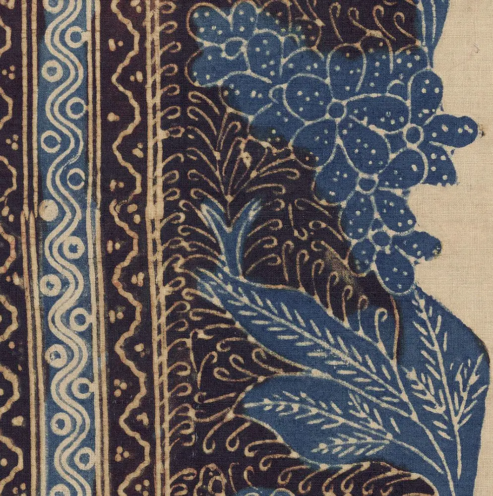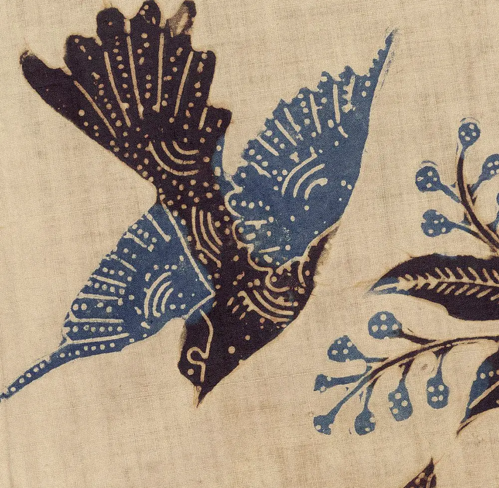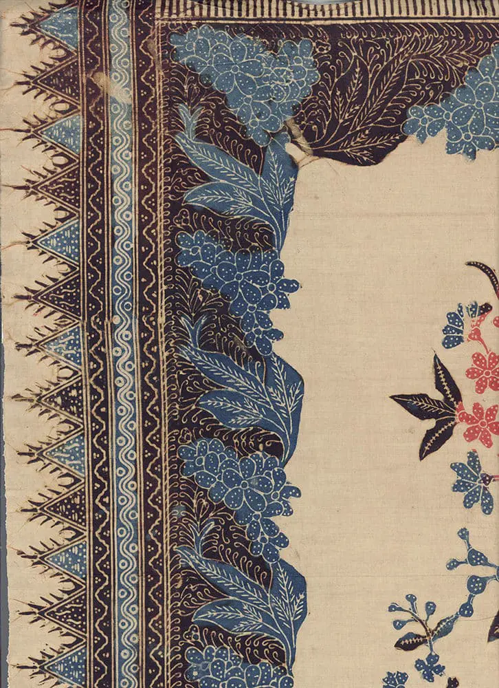 This cloth reflects Garut's taste through its movement, stronger colors, and wider-arching forms, influenced by the older style of Javanese north coast batik. The design's lack of a dominant axis allows it to be appreciated from any angle. The creeping vine, termed lung-lungan, and its scattered blossoms symbolize ritualistic elements. The color combination—red, blue, black, and cream—represents an elaborate traditional north coast style.
