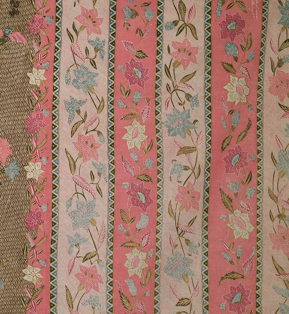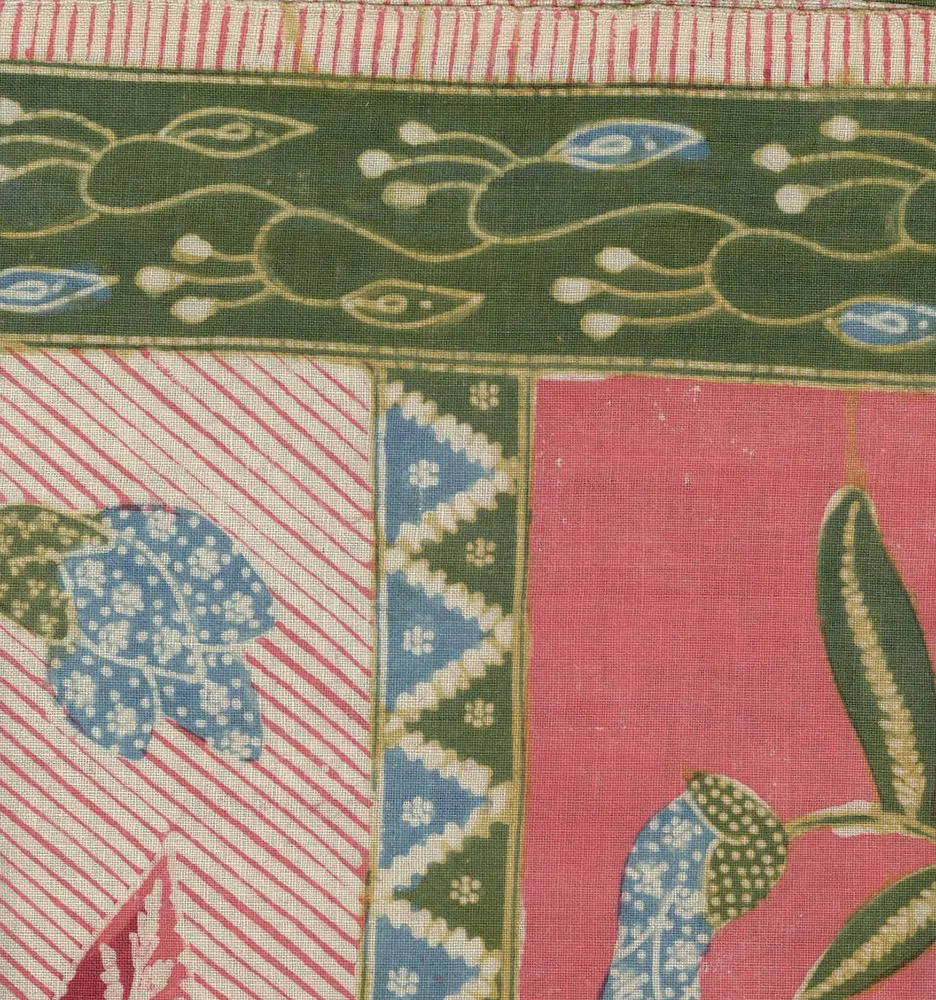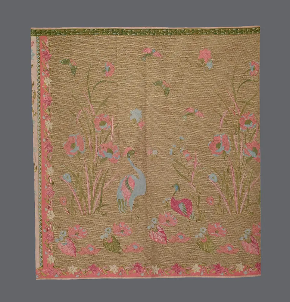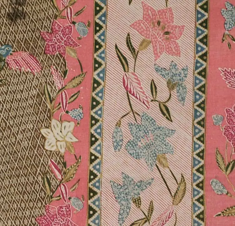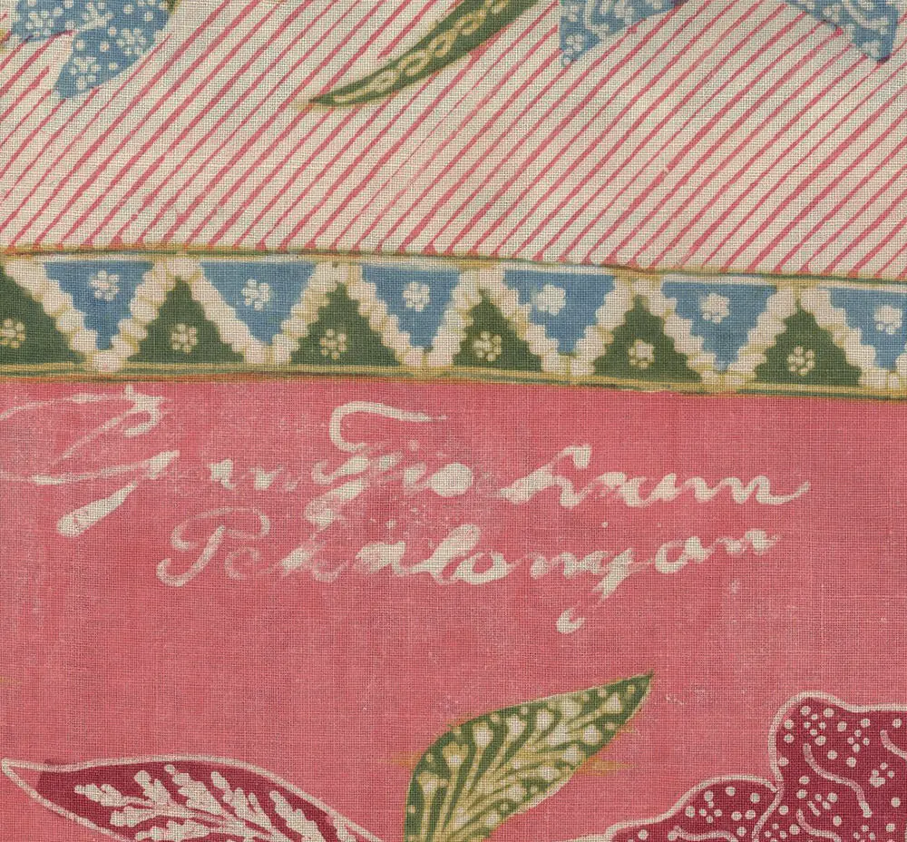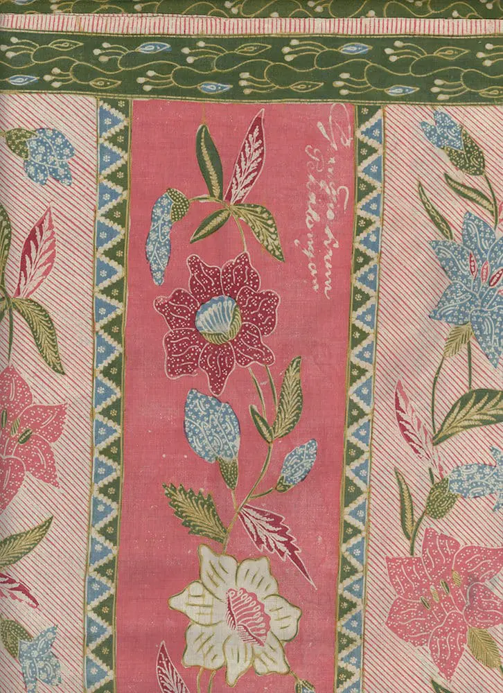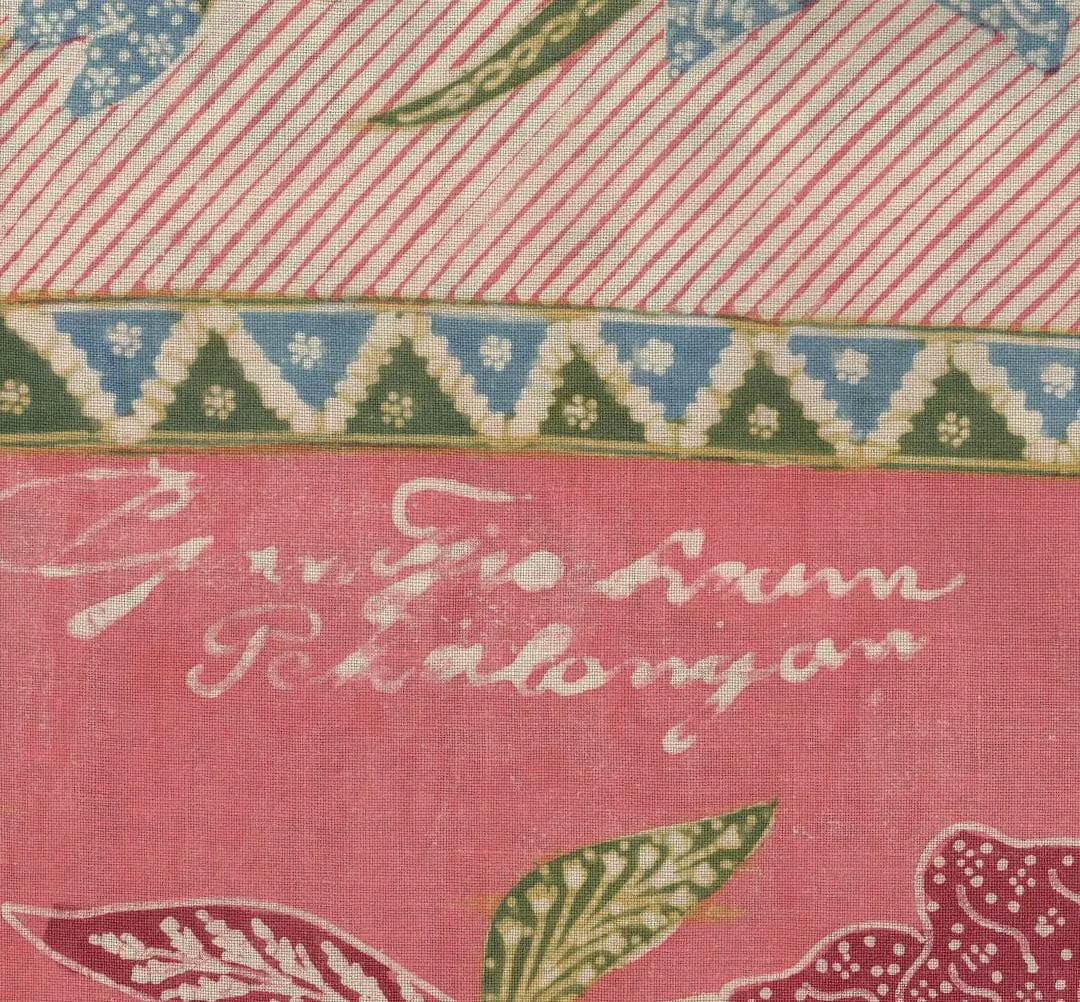 This cotton batik sarong, hand-drawn in Pekalongan, showcases a classic north coast design featuring long-legged cranes amid a water-lily pond. The color composition is light yet bright, a hallmark of Peranakan Chinese artistry in crafting in-between shades, both vibrant and soft. The vivid salmon flowers with green centers and pale yellow stamens intertwine with pale blue petals. The motifs exhibit intricate detailing, a hallmark of top Chinese batik makers. The design includes birds, butterflies, and an ochre diamond lattice with the jelamprang motif, representing woven cloth. The contrasting head panel boasts vertical salmon and pinstriped bands adorned with lily garlands in matching colors. Delicate diagonal lines and lively blue and green zigzags adorn the piece, mimicking woven patterns. Asymmetrical borders feature looping vines, cream and red lilies, extending the head panel's contrast along the body's edge. The drawing is remarkably sharp, creating a sparkling design, heightened by fine pale yellow and green leaves and white filler motifs. The hand-drawn signature of "Gan Tjoe Liam / Pekalongan," a significant pre-war batik maker, graces the upper right corner. This batik, measuring 42 inches (107 cm) by 39 inches (99 cm) in its stitched/unopened state, expands to 78 inches (198 cm) when opened. It's in excellent condition, retaining its freshness, firm body, crisp texture, vivid colors, and precise detailing, without any holes, stains, or tears.