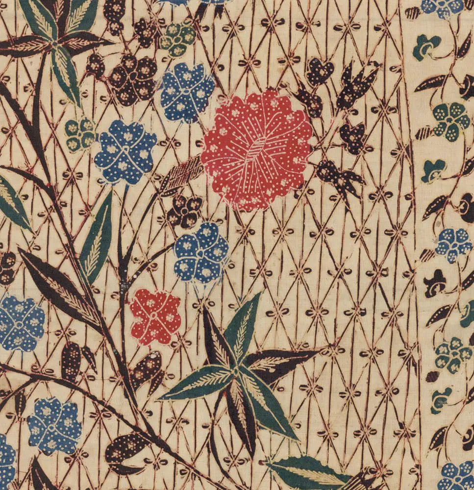 This exquisite early batik shoulder-cloth was hand-drawn in Lasem, located on the north coast of Java, by Peranakan Chinese batik-makers. It closely follows the style and format of the typical Indo-Chinese sarong of that period. The design features four repetitions of a flowering tree sweeping to the left, a subtle departure from the usual symmetrical tree, gracefully guiding the eye's movement with a hovering bird and butterfly at its tips.