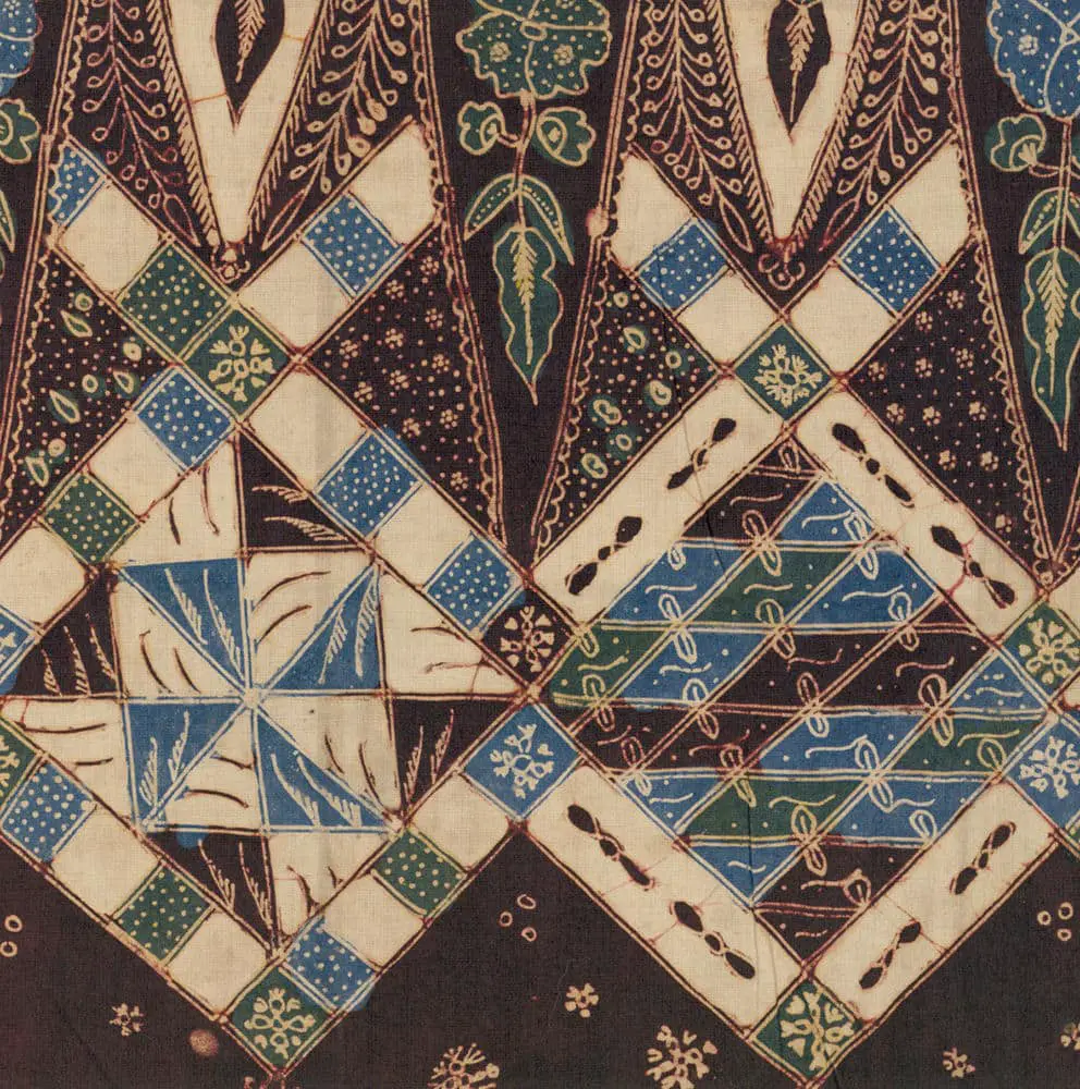 This batik presents a collage of motifs that, despite its typically crowded format, exudes remarkable harmony and gentleness. The basketwork motif forming the background exhibits a remarkable lightness of touch, complementing the rich tones of the natural red-brown, which adds depth to the design.