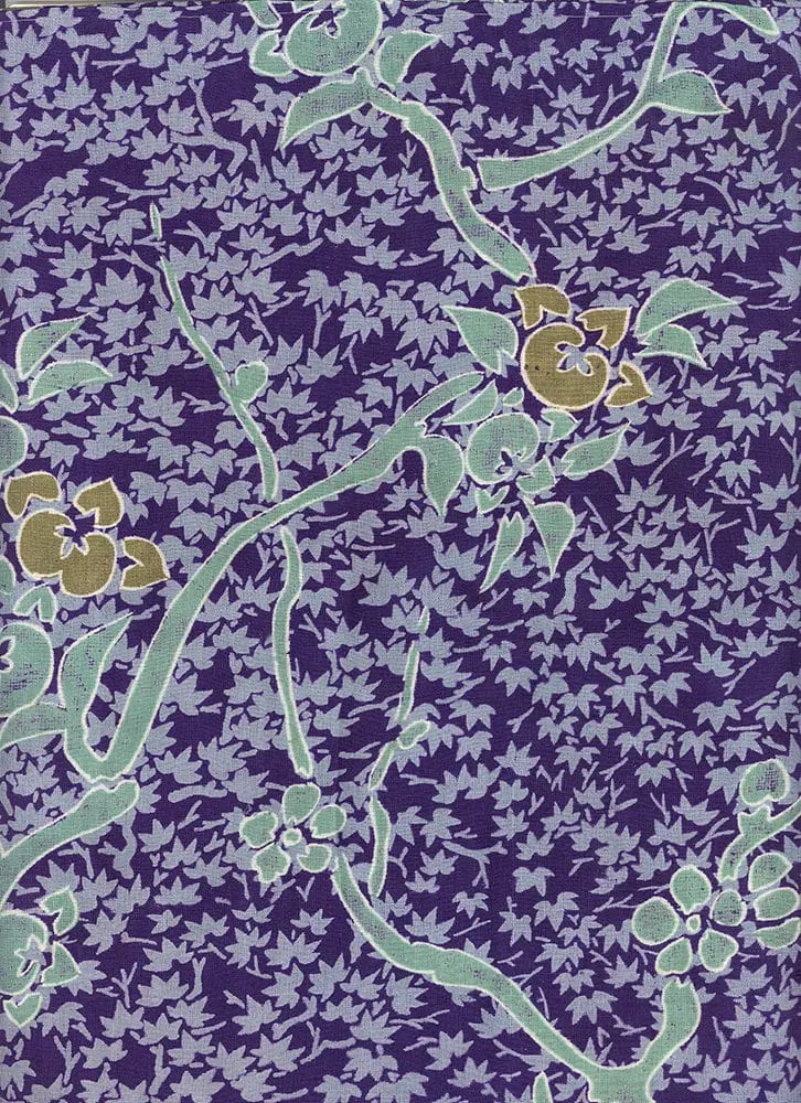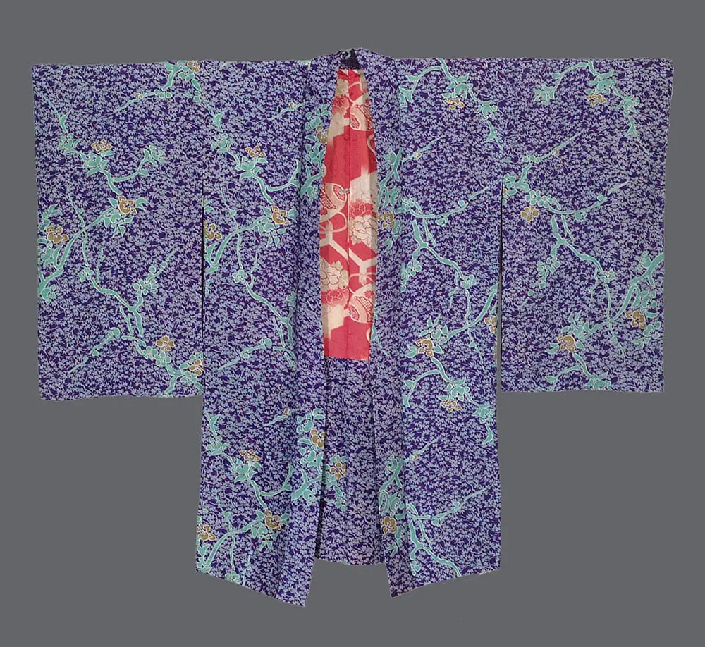 This haori displays an intricate network of dyed patterns, showcasing ume blossom, tachibana, and maple leaves. The silk used is a "jiginu," known for its roughly spun texture found in some of Japan's rural districts. It's in very good condition and measures 50 inches (127 cm) from sleeve-end to sleeve-end with a height of 38 inches (97 cm).