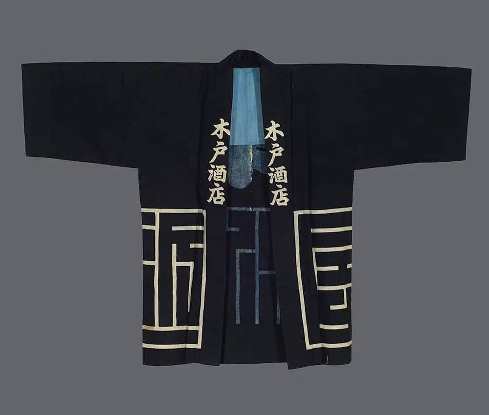 The design reflects the influence of modernist sensibilities that were permeating Japanese design during the 1920s and 1930s, particularly the geometric abstraction that characterized the period's graphic arts and industrial design. The labyrinthine lower pattern demonstrates the technical mastery of katazome artisans, who could achieve such precise, complex geometric repeats through their sophisticated stencil-cutting techniques. This type of angular, maze-like motif became increasingly popular during Japan's modernization period, reflecting both traditional Japanese geometric patterns and contemporary influences from Art Deco and Bauhaus design movements that were being absorbed into Japanese visual culture. The bold contrast and graphic clarity of the design would have made this garment both functional workwear and a statement of modern style, embodying the democratic ideals of mingei (folk craft) philosophy that celebrated the beauty found in everyday utilitarian objects. The protective roof symbol above the family crest suggests themes of shelter and prosperity, while the geometric maze below might represent life's journey or the interconnectedness of community bonds.