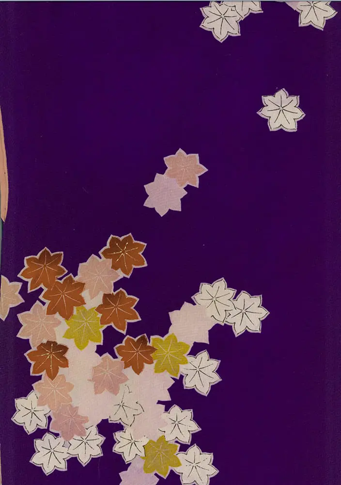 This silk kimono displays small maple leaves on a vibrant purple background and is in very good condition. It measures 50 inches (127 cm) from sleeve-end to sleeve-end and stands at a height of 58 inches (147 cm).