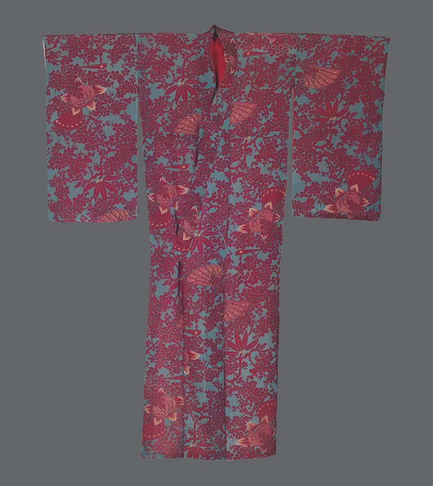 This silk kimono showcases small red and yellow fans, bamboo stalks, and ume (plum blossoms) against a blue background. It's in very good condition and measures 49 inches from sleeve-end to sleeve-end, with a height of 59 inches (124 cm x 150 cm).