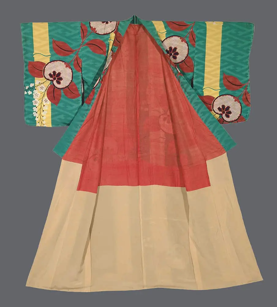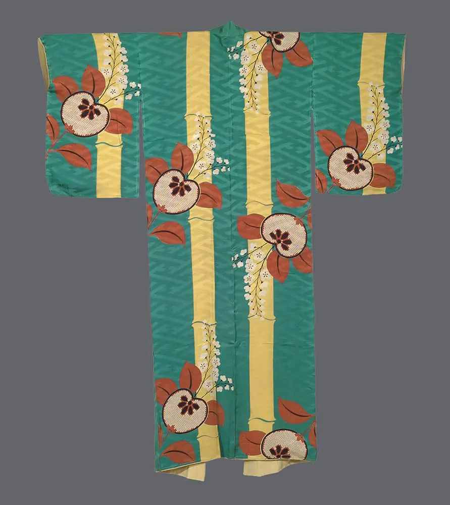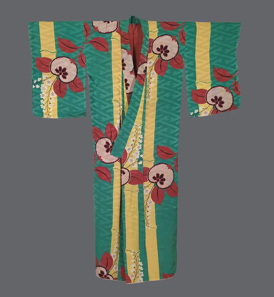 This silk kimono has a striking composition that employs alternating vertical stripes of emerald green and pale yellow that create a rhythmic foundation reminiscent of Art Deco's geometric emphasis, while the silk-screened design technique demonstrates the period's embrace of mechanized production methods alongside traditional craftsmanship. The underlying rinzu damask fabric featuring the classical sayagata pattern—an ancient geometric motif of interlocking key-fret designs—provides a subtle textural foundation that speaks to the continuity of Japanese decorative traditions even as surface designs embraced contemporary innovations.