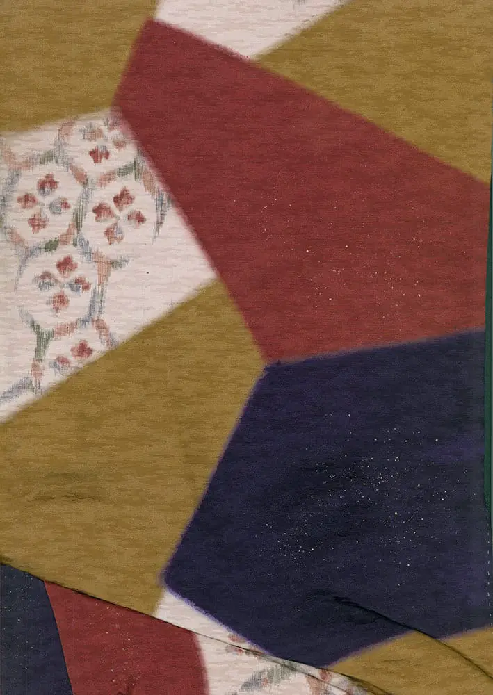 The design employs a dynamic tessellation of irregular polygonal shapes in navy, coral red, olive gold, and cream, creating an almost kaleidoscopic effect that suggests both traditional origami paper folding and contemporary abstract art. The small-scale floral motifs scattered across the cream sections provide textural interest while maintaining the overall geometric coherence—a sophisticated balance between pattern density and visual rest. This approach reflects the influence of Western modernist design principles, particularly the Bauhaus school's emphasis on geometric abstraction and functional beauty, filtered through Japanese aesthetic sensibilities that prize asymmetrical balance and subtle variation within repetitive patterns.