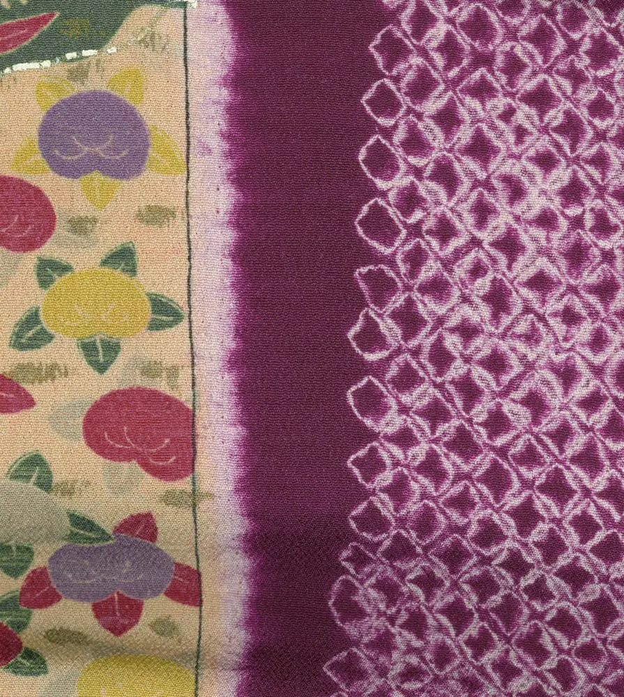 This vibrant chirimen silk kimono features yabane (arrow feather) patterns executed in two distinct methods: silkscreened versions displaying colorful floral compositions of chrysanthemums, plums, and other seasonal blooms on cream-colored grounds, and shibori-resist dyed versions creating geometric lattice patterns in white against the rich burgundy base fabric. The arrow feather motif, traditionally associated with protection from evil and the ability to ward off misfortune, takes on new visual dynamism through this dual technical approach.The aesthetic demonstrates clear influence from the Taishō and early Showa periods' embrace of bold pattern mixing and technical innovation, reflecting both Art Deco sensibilities and the Japanese concept of "shin" (new) in the classical shin-gyō-so progression of artistic styles. The overlapping arrangement of differently treated yabane creates visual depth and complexity, while the alternating techniques produce contrasting textures that enhance the chirimen silk's natural lustrous quality. The floral compositions within the silkscreened sections display a painterly quality reminiscent of contemporary nihonga painting, with their loose, naturalistic rendering of seasonal flowers creating intimate vignettes within the geometric arrow feather framework. This kimono represents a pivotal moment in Japanese textile history when traditional craftsmanship met industrial innovation, resulting in designs that maintained cultural symbolism while embracing new aesthetic possibilities. The shibori technique, with its ancient roots in Japanese resist-dyeing traditions, creates the geometric lattice patterns that speak to modernist design principles, while the silkscreen printing allows for the detailed floral imagery that connects to classical Japanese decorative arts. The overall effect is a garment that successfully bridges traditional and contemporary sensibilities, embodying the cultural dynamism of Japan's rapid modernization period while preserving the protective symbolism inherent in the yabane motif.