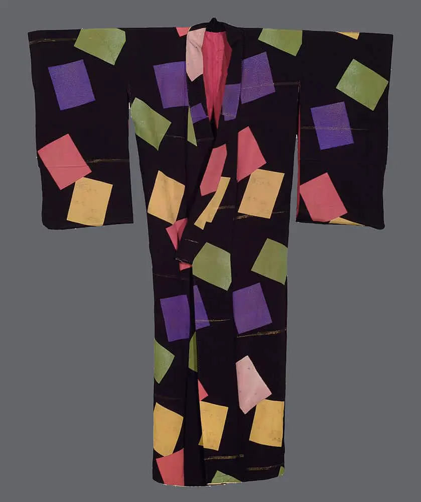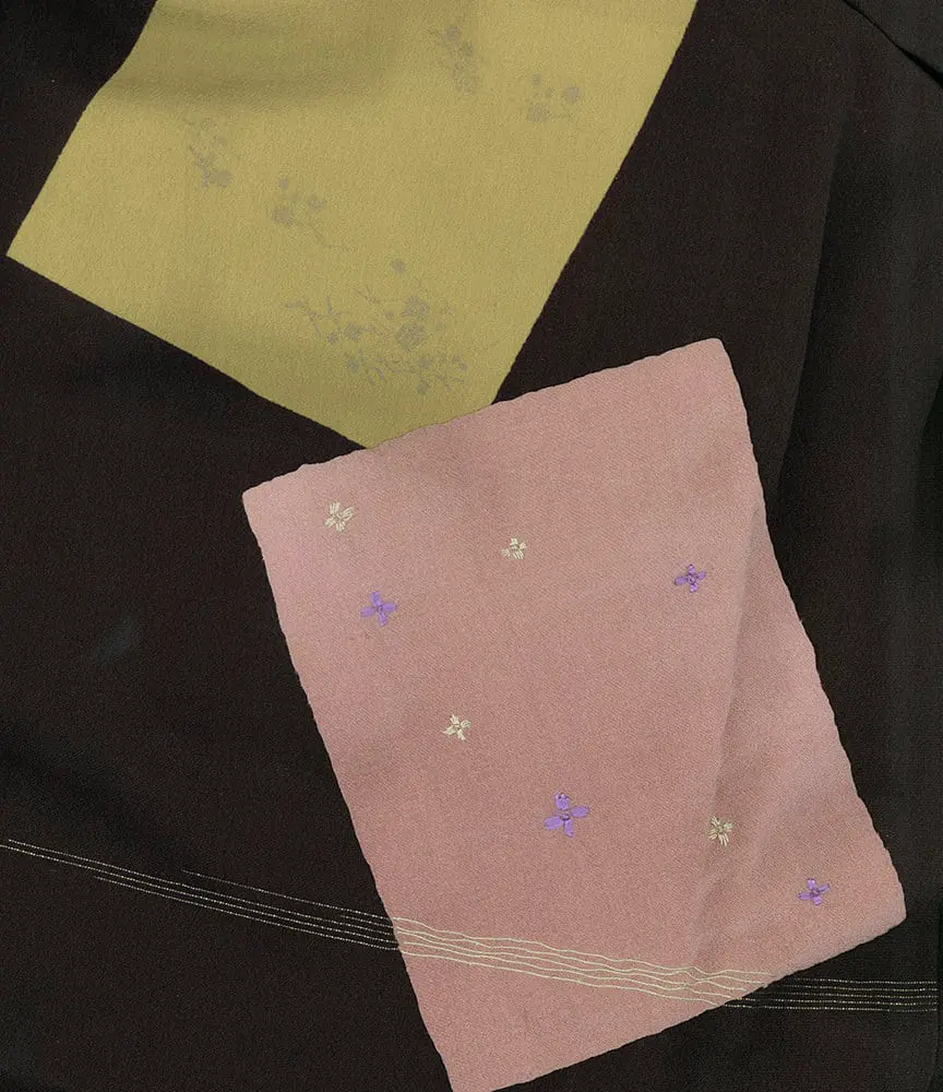 This striking chirimen silk kimono represents a bold departure from traditional Japanese textile design, embracing the geometric abstraction and color experimentation that characterized the international modernist movement of the 1920s-30s. The garment features an all-over pattern of irregular rectangular patches in vibrant hues - coral pink, golden yellow, sage green, and deep purple - scattered across a rich black ground in a seemingly random yet carefully balanced composition. This radical design approach reflects the influence of European avant-garde movements, particularly Constructivism and De Stijl, which emphasized pure geometric forms and bold color relationships as expressions of modern industrial aesthetics. The technical execution demonstrates the sophisticated integration of traditional Japanese textile techniques with contemporary design sensibilities. The silkscreen printing method used for the colored rectangles represents the adoption of modern industrial processes, while the delicate embroidered highlights visible in the pink sections and the incorporation of gold metallic threads maintain connections to Japan's centuries-old luxury textile traditions. The detail images reveal subtle floral motifs - small purple and gold blossoms with linear accents - that provide a gentle nod to classical Japanese decorative vocabulary while being thoroughly integrated into the modernist aesthetic framework. This kimono embodies the complex cultural negotiations of Japan's interwar period, when the country was simultaneously embracing Western modernization while seeking to maintain its cultural identity. The geometric abstraction speaks to contemporary movements in art and design, yet the careful attention to color harmony, the quality of the chirimen silk with its characteristic subtle texture, and the masterful integration of multiple techniques reflect deeply rooted Japanese aesthetic principles. The result is a remarkable synthesis that positions this garment as both a product of its specific historical moment and a timeless example of how traditional craftsmanship can successfully engage with radical design innovation.