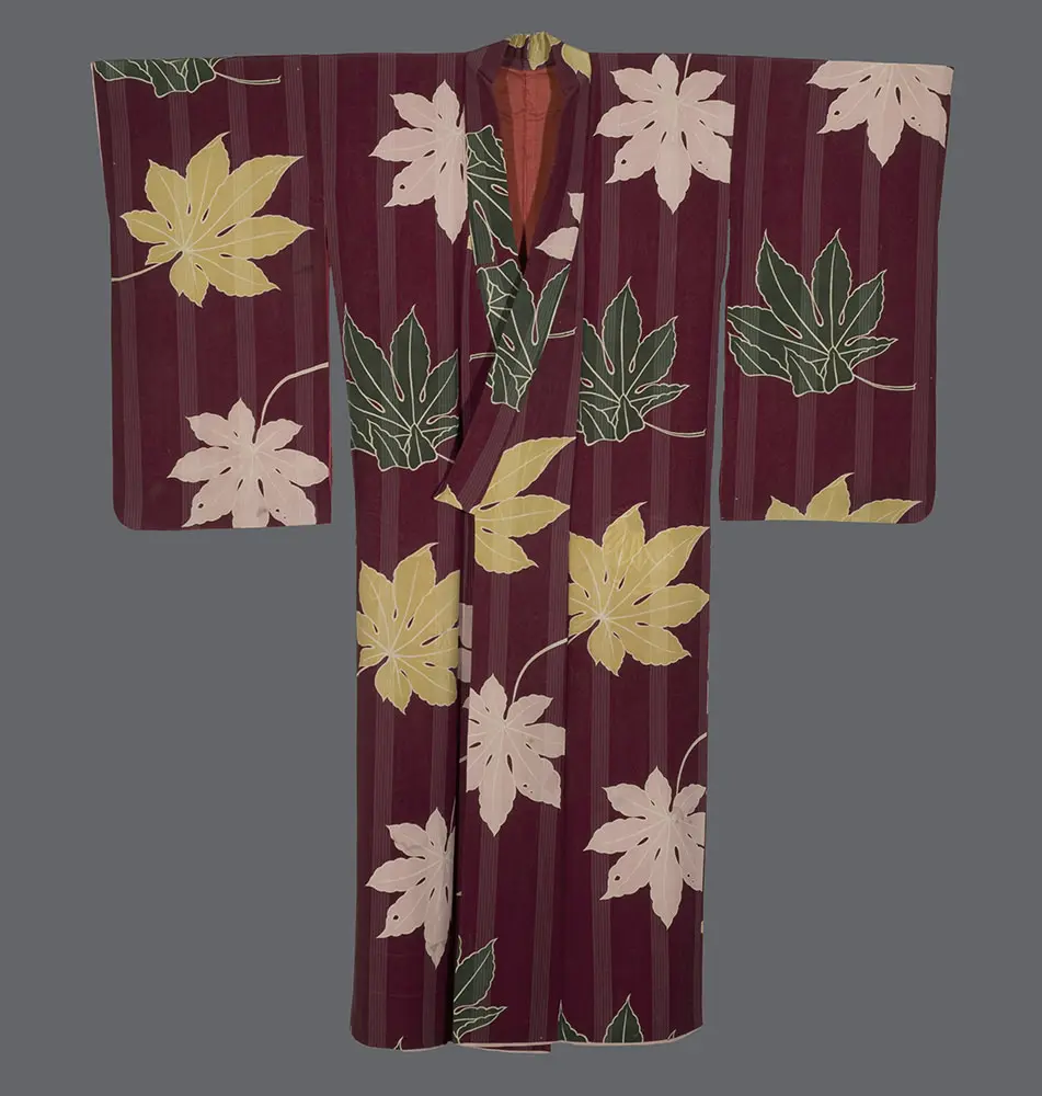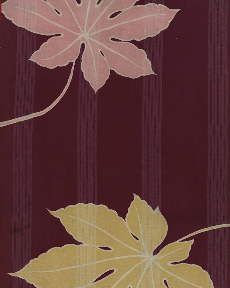 This elegant chirimen silk kimono features a striking composition of fatsia leaves (yatsude) rendered in golden yellow, soft pink, and deep green against a rich burgundy ground, their broad, palmate forms scattered asymmetrically across the textile surface. The leaves appear to float gracefully against the backdrop of subtle vertical damask stripes, creating a harmonious tension between organic naturalism and structured geometric patterning that reflects the Taisho period's distinctive aesthetic sensibility. The fatsia leaf motif carries profound symbolic meaning in Japanese culture, representing protection, good fortune, and prosperity due to the plant's hardy nature and eight-fingered leaves (ya-tsu-de literally meaning "eight hands"). This symbolism made it particularly popular during the Taisho era, when Japan was experiencing rapid modernization and cultural transformation, as the leaves suggested both stability and the reaching toward new possibilities. The stenciling technique used to create these motifs demonstrates the period's technological advancement in textile production, allowing for precise repetition while maintaining the handcrafted aesthetic quality prized in traditional Japanese design. Artistically, this kimono reflects the influence of both Art Nouveau's organic forms and the emerging Art Deco movement's geometric sensibilities, characteristic of the Taisho period's unique position between traditional Japanese aesthetics and Western modernist influences. The vertical damask stripes create a subtle textural foundation that anchors the floating leaf motifs, while the sophisticated color palette of burgundy, gold, and muted pastels demonstrates the refined taste of the era. The chirimen silk's characteristic crepe texture, achieved through highly twisted yarns, adds tactile interest and creates subtle variations in light reflection that enhance the overall visual richness of this beautifully preserved example of early 20th-century Japanese textile art.