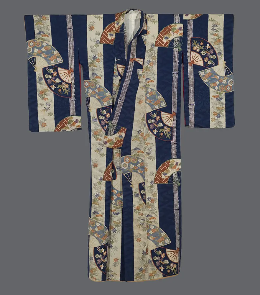 Cascading across this striped ground are intricately detailed fan motifs. In Japanese culture, the fan is a potent and auspicious symbol. Its unfolding shape, known as suehirogari, represents a widening path to prosperity and a flourishing future. The fans themselves are adorned with a variety of traditional patterns, including delicate florals and geometric designs, created using sophisticated screen-printing techniques. The combination of the auspicious fan and the resilient, fast-growing bamboo (a symbol of strength and perseverance) creates a layered message of good fortune, strength, and a prosperous life. The kimono is a beautiful example of how traditional Japanese symbolism was integrated with modern design sensibilities in the early 20th century.