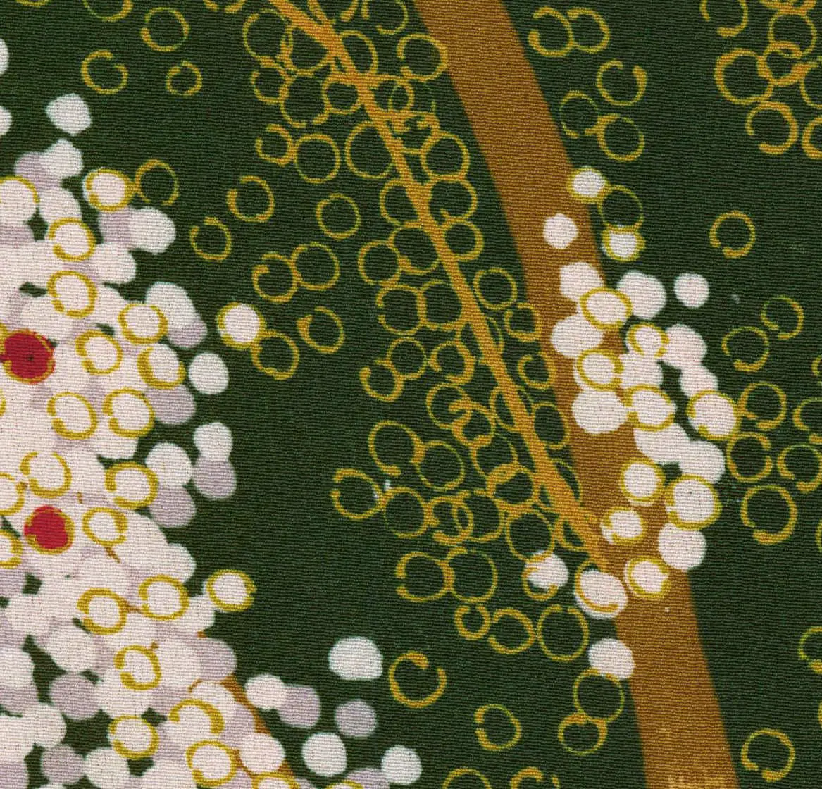 This silk kimono demonstrates the revolutionary impact of silkscreen printing technology on Japanese textile design, transforming traditional motifs through industrial production methods that allowed for bold, graphic interpretations of classical themes. The design features stylized bamboo stalks rendered in golden brown against a deep forest green ground, with cascades of white cherry blossoms created through densely packed circular forms that blur the line between naturalistic representation and abstract pattern-making. The silkscreen technique enables a level of precision and uniformity in the repetitive circular elements that would be nearly impossible to achieve through hand-painting, while the subtle variations in the blossom clusters—some incorporating tiny touches of coral and rose—add visual interest and prevent the mechanical regularity from becoming monotonous.