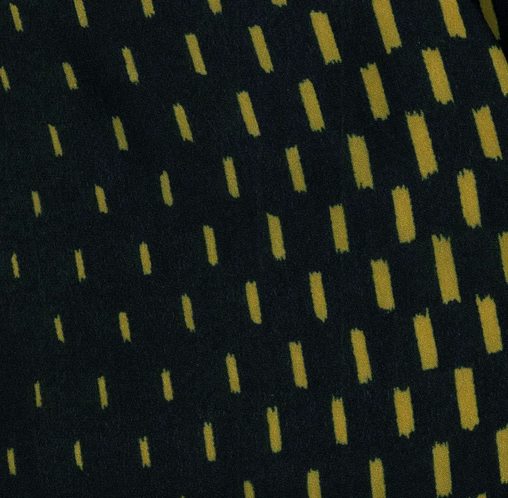 The minimalist aesthetic reflects the influence of both Western modernist design principles and traditional Japanese concepts of restraint and negative space, demonstrating how post-war Japanese textile artists successfully synthesized international trends with indigenous sensibilities. The choice of golden yellow against dark green creates a sophisticated color harmony reminiscent of autumn foliage or the interplay of sunlight filtering through dense forest canopy. The silkscreen technique allows for precise registration and uniform color saturation while maintaining the soft hand of silk fabric. This printing method represented a democratization of kimono production, making stylish garments more accessible while enabling designers to experiment with patterns that would have been prohibitively complex using traditional resist-dyeing methods.