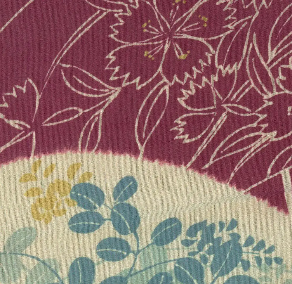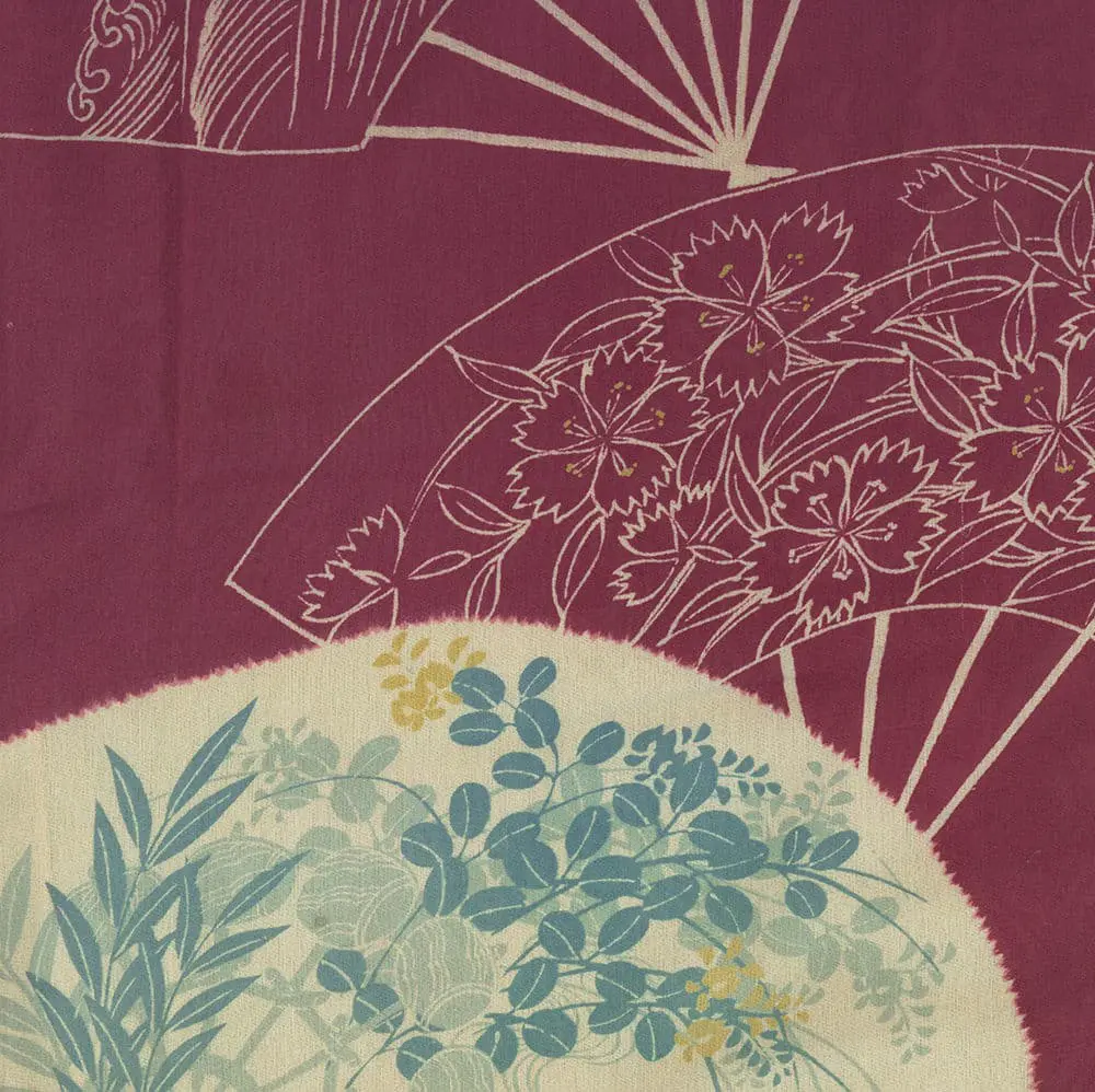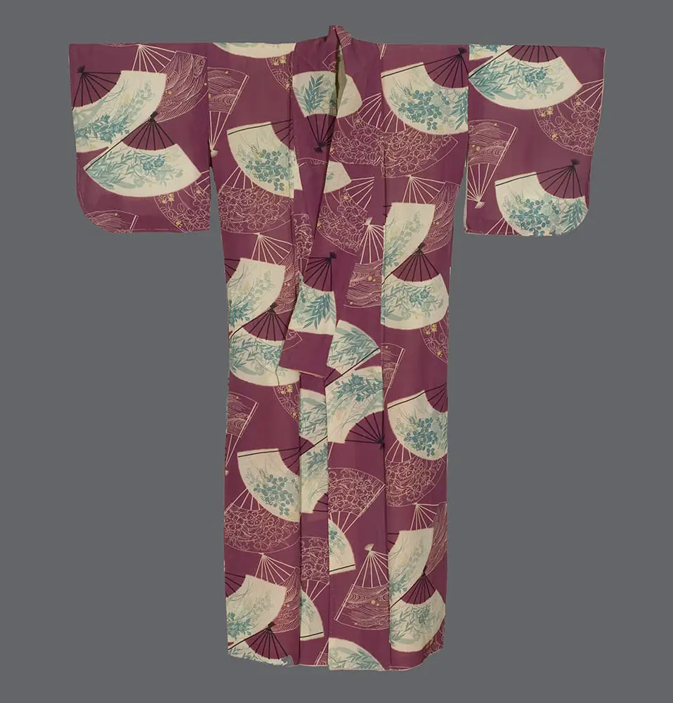 This silk kimono displays silk-screened fan motifs and includes a cotton lining. The exterior is in very good condition, while the inner cotton lining has stains (potentially removable). It measures 48 inches (121.9 cm) from sleeve-end to sleeve-end and has a height of 57 inches (144.8 cm).