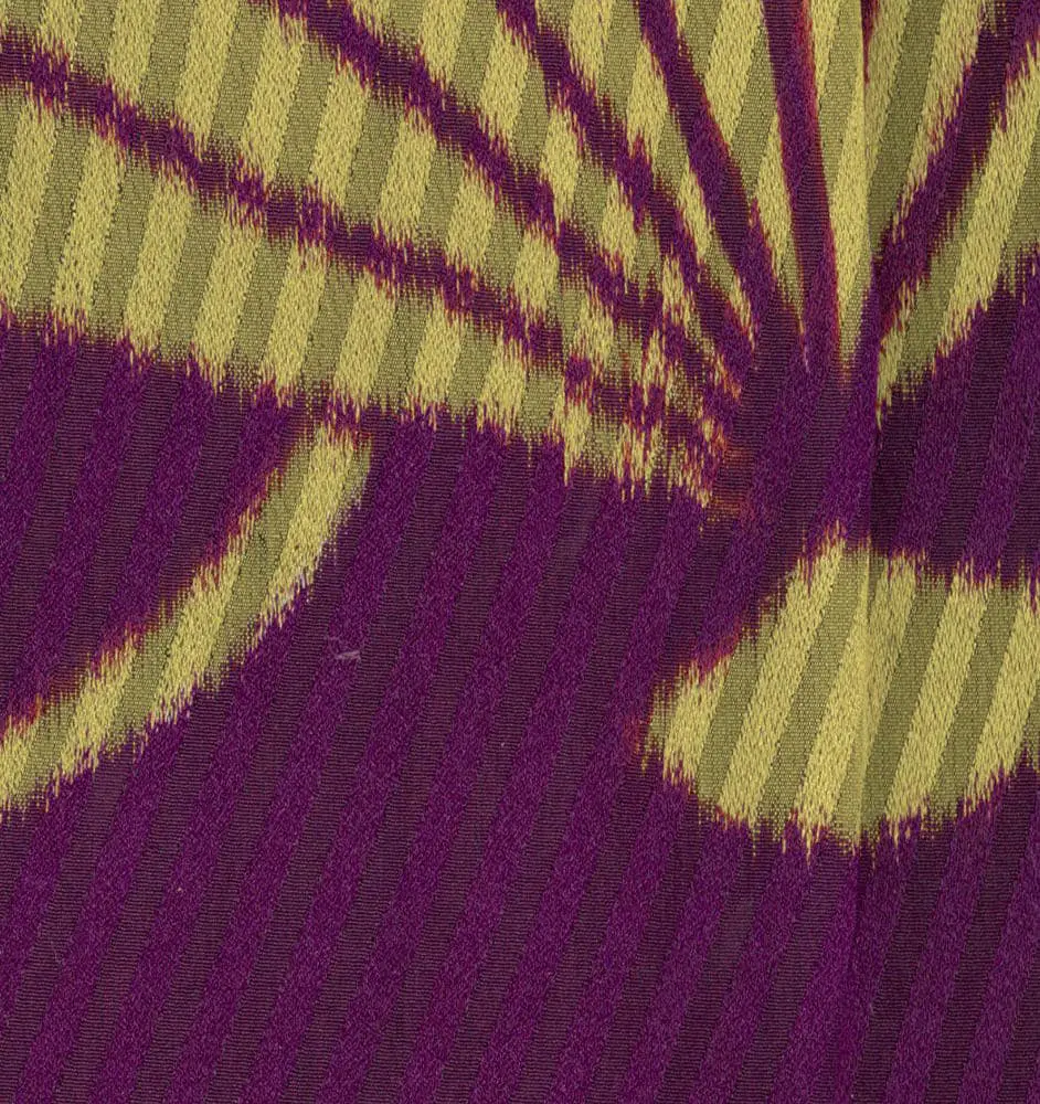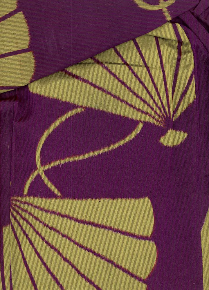 This silk kimono showcases large yellow silkscreened fans and measures 49 inches (124 cm) from sleeve-end to sleeve-end, with a height of 61 inches (155 cm). It's in very good condition, presenting only minor imperfections.