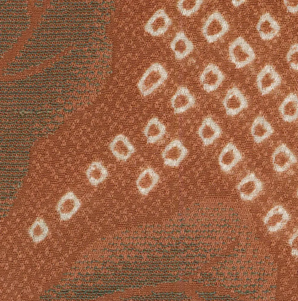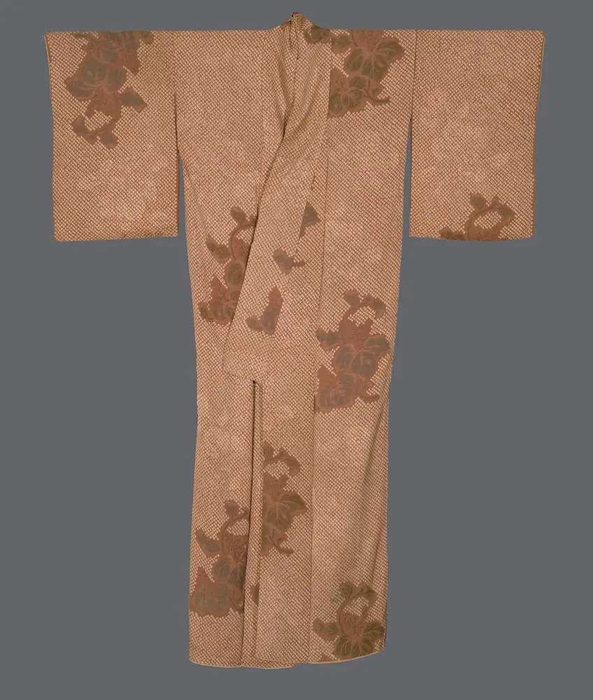 The detailed view reveals the remarkable technical achievement of combining multiple weaving and dyeing methods within a single textile. The interplay between the assertive omeshi flowers and their subtle rinzu counterparts demonstrates the Japanese aesthetic principle of jo-ha-kyū (introduction, development, climax), where elements build upon each other in sophisticated harmony. This approach reflects the influence of both traditional court aesthetics and the emerging modernist sensibilities of the early 20th century, creating a garment that speaks to Japan's ability to honor classical techniques while embracing contemporary design innovations. The floral symbolism would have carried seasonal and poetic associations, with the layered presentation suggesting the ephemeral nature of beauty and the cyclical patterns of nature that are central to Japanese artistic philosophy.