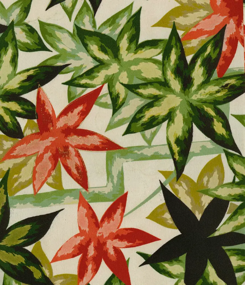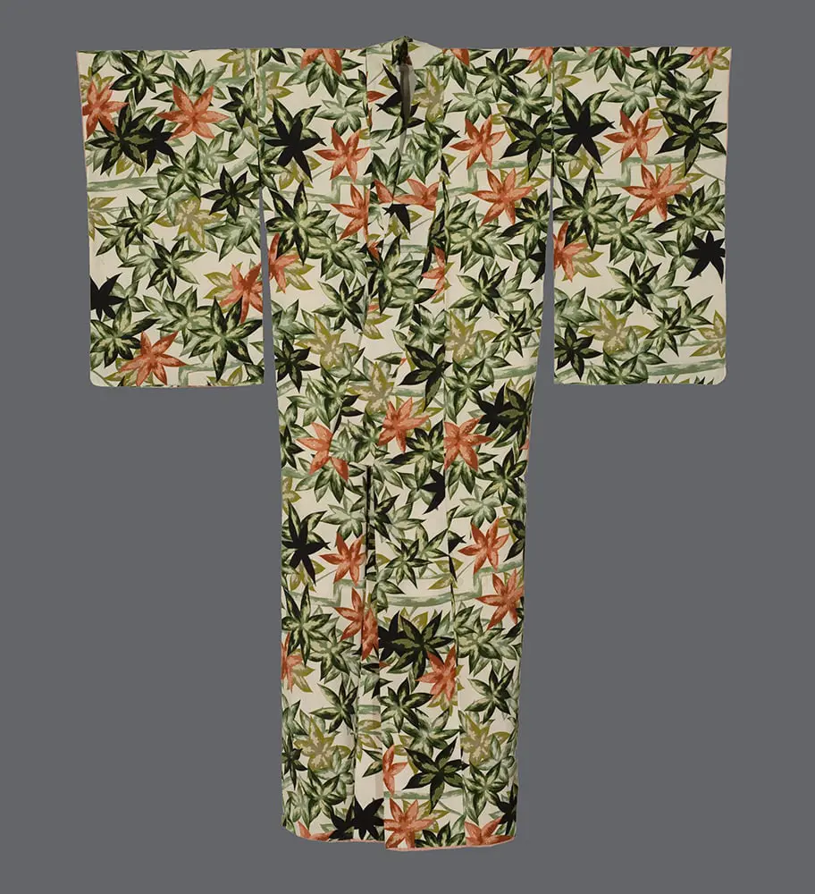 This silk kimono, adorned with leaf motifs, is in very good condition with minor imperfections. It measures 48 inches from sleeve-end to sleeve-end and stands 56 inches in height.