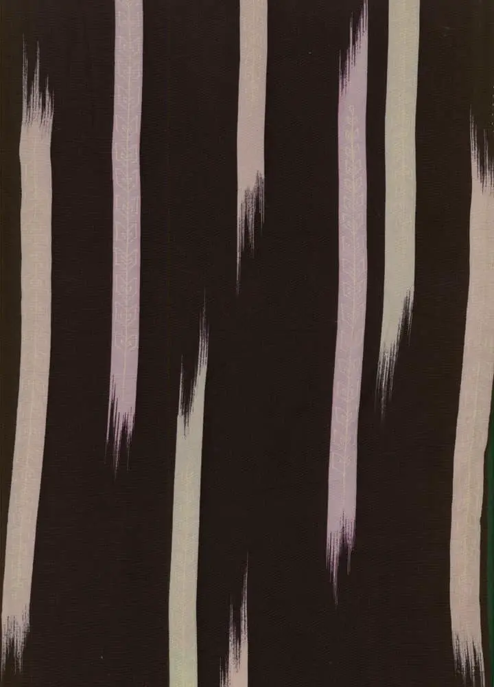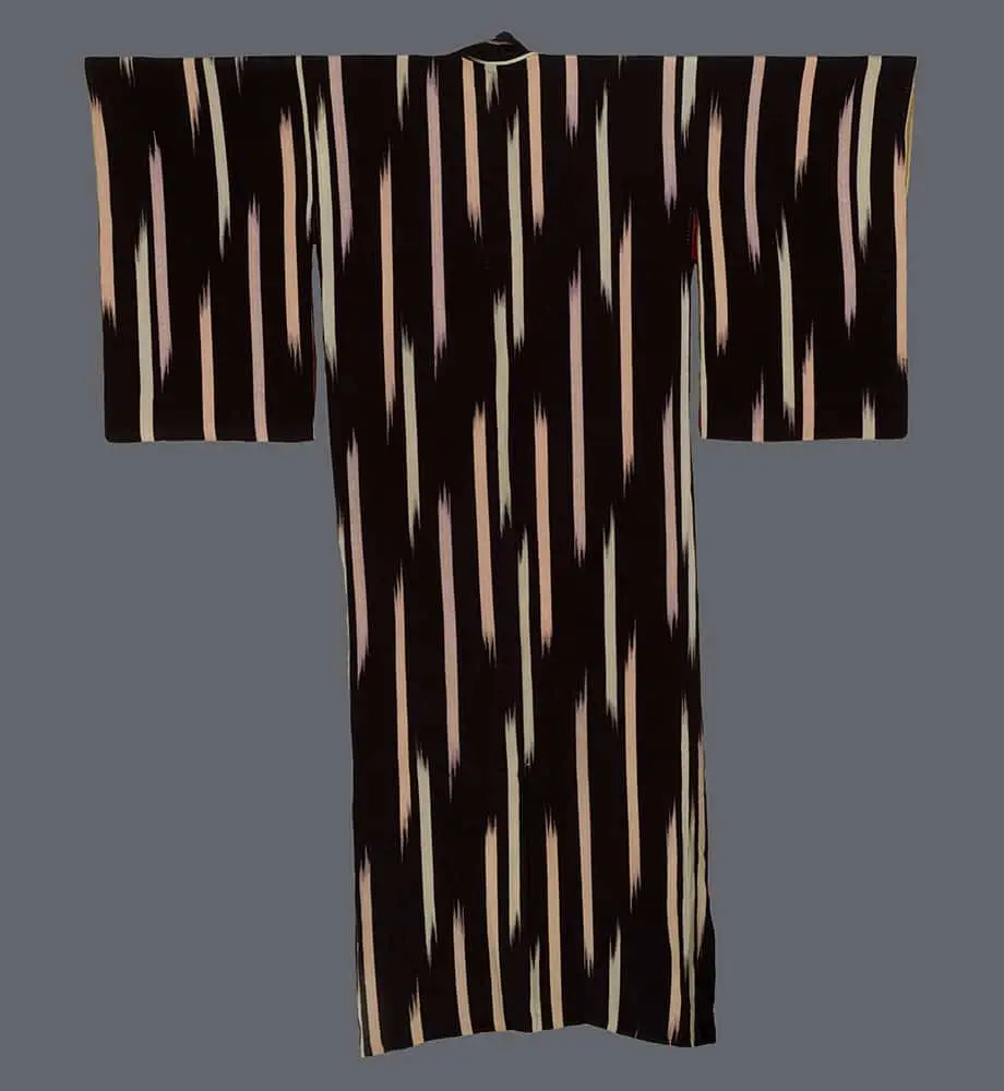 The stenciling or silk-screening technique allows for this unique combination of precision and spontaneity - the overall stripe structure is controlled while the irregular edges suggest natural processes like erosion, melting, or organic growth. This kimono demonstrates how Japanese textile artists were exploring the expressive potential of industrial processes decades before similar investigations appeared in Western contemporary art.