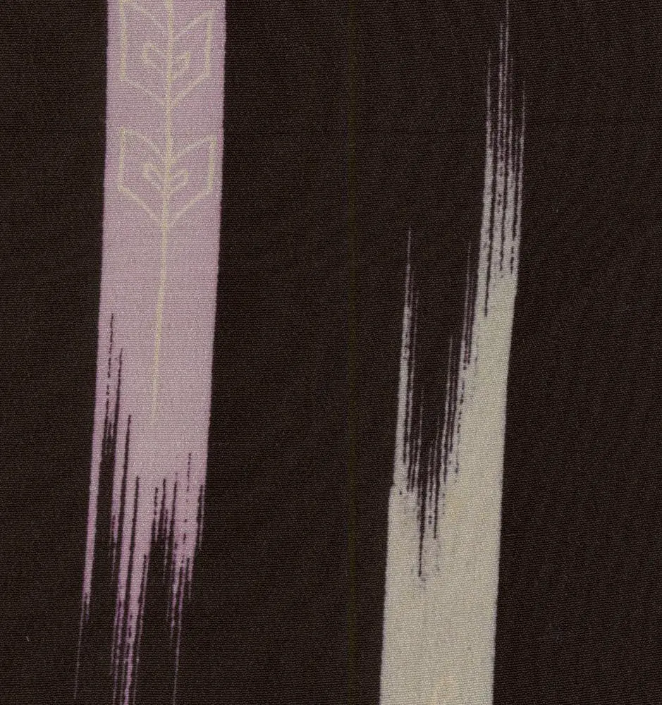 This silk kimono displays a striking pattern of vertical stripes with dramatically feathered, irregular edges against a deep brown ground. The stripes appear in cream, pale lavender, and soft pink tones, with their boundaries dissolving into jagged, flame-like or icicle-like projections that create a sense of movement and energy.