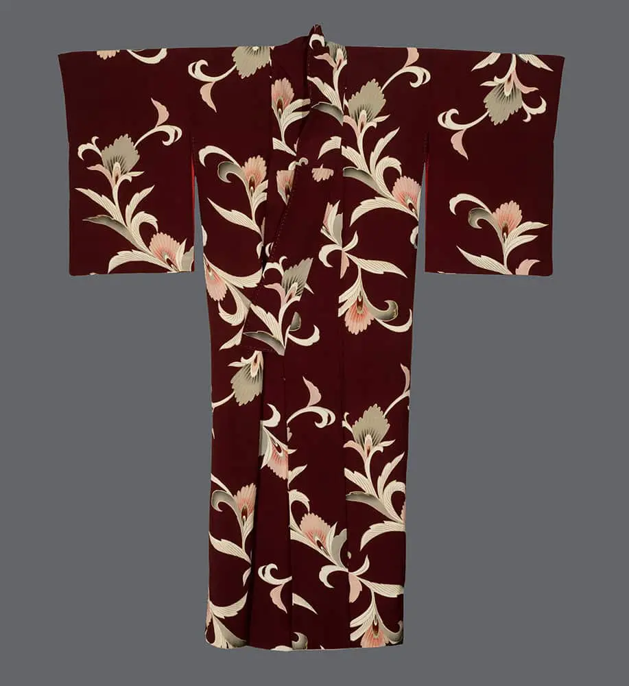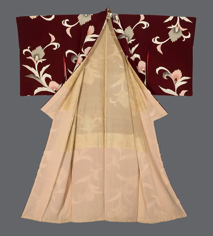 This chirimen silk kimono, set against a rich burgundy ground, features gracefully stylized carnation or dianthus blossoms rendered in soft pink and coral tones, their petals delicately outlined and enhanced with gold foil highlights that catch and reflect light with luxurious subtlety. The flowing, curvilinear composition demonstrates the influence of Art Nouveau's organic forms, while the sophisticated color palette and the precise silk-screening technique reflect the period's embrace of both artistic refinement and industrial innovation.