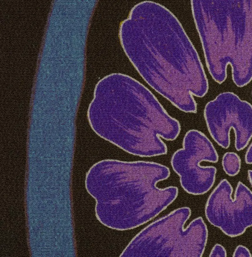 The artistic execution combines stenciling with silk-screening techniques to achieve remarkable precision and color gradation. The chrysanthemums appear in three distinct colorways - golden yellow, soft blue-gray, and rich purple - each rendered with subtle tonal variations that give dimensional quality to the flat petals. The detail images reveal the sophisticated silk-screening process, showing how the purple chrysanthemums display nuanced color transitions from deep violet at the edges to lighter lavender toward the centers.