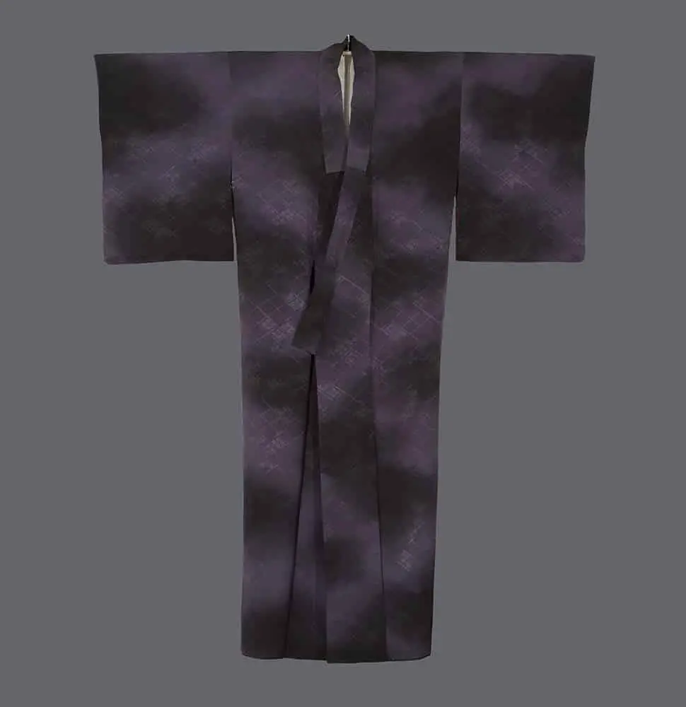 The rinzu (damask) silk kimono presents a subtle yet sophisticated interplay of surface effects. A woven lattice motif in the damask emerges only under shifting light, creating a quiet geometric order beneath the soft, cloudlike overlays of deep gray and black. This layered effect blends the precision of structured patterning with an atmospheric abstraction, where the cloudy dyeing recalls ink-wash painting traditions (sumi-e) and suggests drifting mist or shadow.