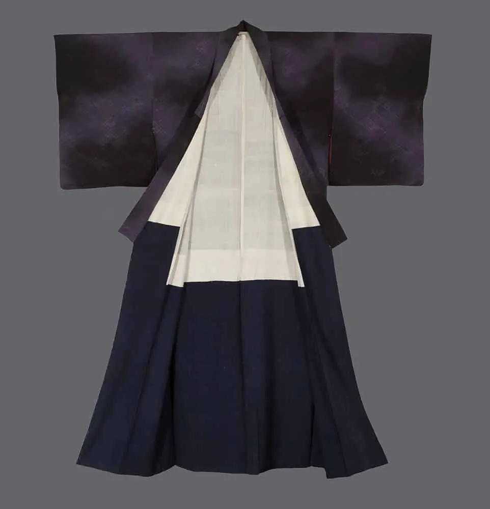 The aesthetic resonates with Japanese postwar explorations of restraint and ambiguity, echoing the mood of mono no aware—an awareness of impermanence and the unseen. At the same time, the blurred, abstract overlays parallel developments in modern art, particularly Abstract Expressionism’s atmospheric fields and postwar European Tachisme, both of which explored gestural ambiguity and the dissolving of form. By fusing woven geometry with painterly softness, the textile reflects a mid-20th-century dialogue between tradition and abstraction, anchoring the garment within both cultural continuity and modernist sensibility.