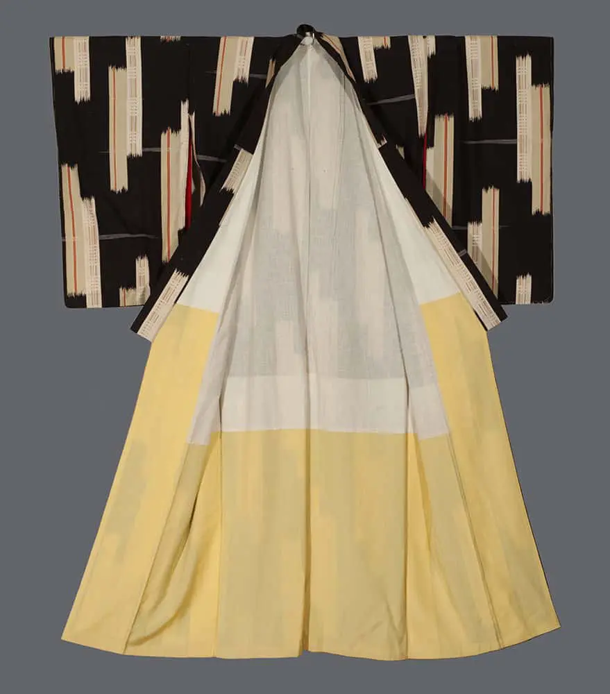 This kimono is a testament to the dynamic artistic fusion of its time. The garment is crafted from kinsha, a fine silk crepe known for its delicate texture and graceful drape. The all-over pattern features bold, vertical stripes against a black background, rendered in earthy tones of beige, cream, and a subtle terracotta red. These stripes are not uniform; they possess the characteristic blurred and staggered edges of ikat, a traditional resist-dyeing technique. However, in this piece, the effect is ingeniously replicated through silkscreening, creating a "faux ikat" that was a modern innovation of the era. This method allowed for the desirable aesthetic of ikat with greater production efficiency.