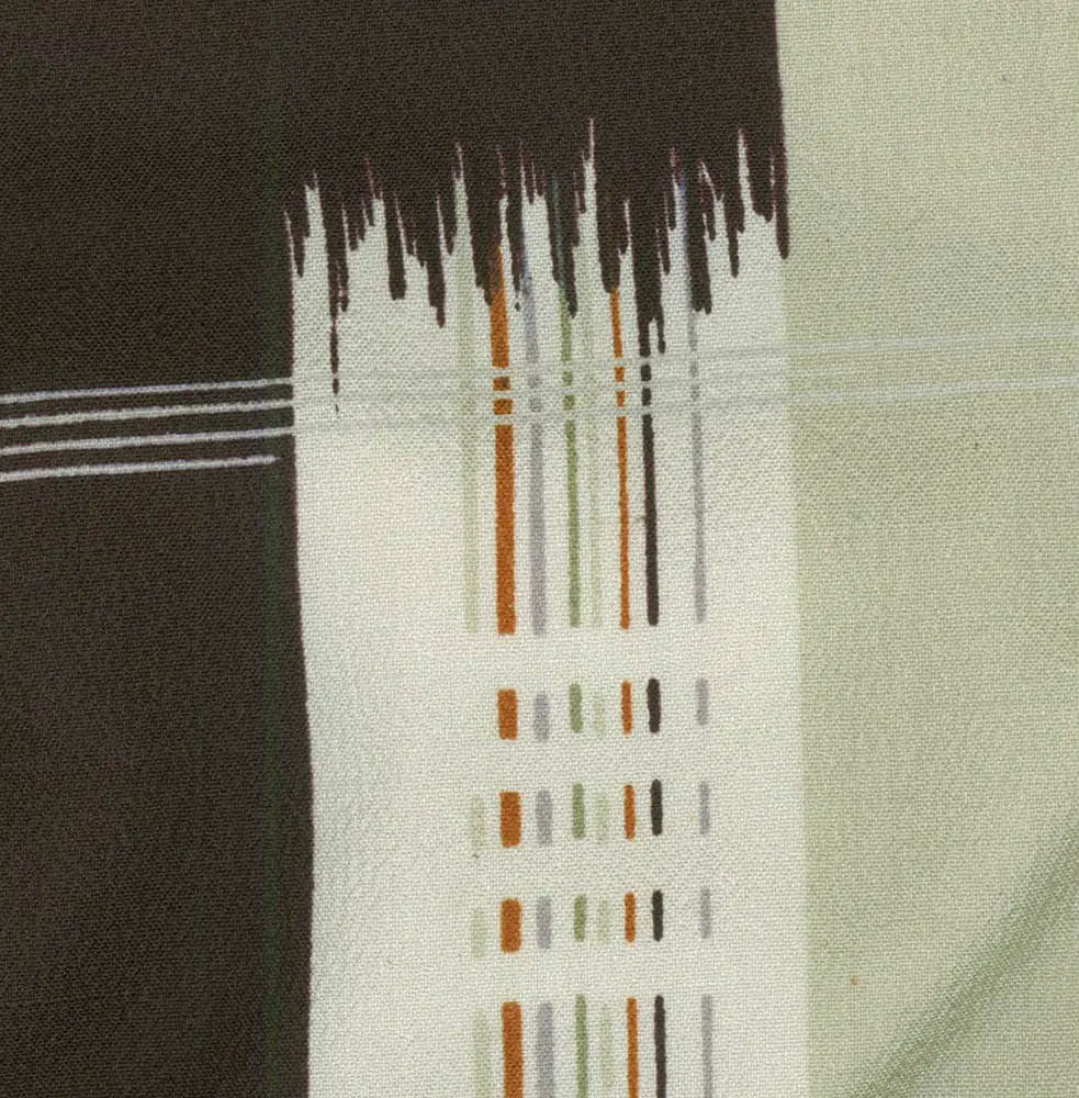 The design itself evokes multiple artistic currents. The strong, graphic quality of the vertical motifs resonates with the burgeoning Art Deco movement, which was gaining international traction and influencing Japanese design. The abstract and somewhat calligraphic nature of the stripes also hints at a modernist reinterpretation of traditional Japanese aesthetics. While the specific symbolism of this abstract motif is open to interpretation, the verticality could suggest strength, growth, or the falling rain, all common themes in Japanese art. The overall impression is one of sophisticated and forward-thinking design, embodying the "Taishō Roman" spirit that embraced both Western artistic ideas and a renewed appreciation for Japanese cultural motifs, albeit through a modern lens.