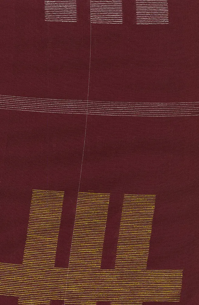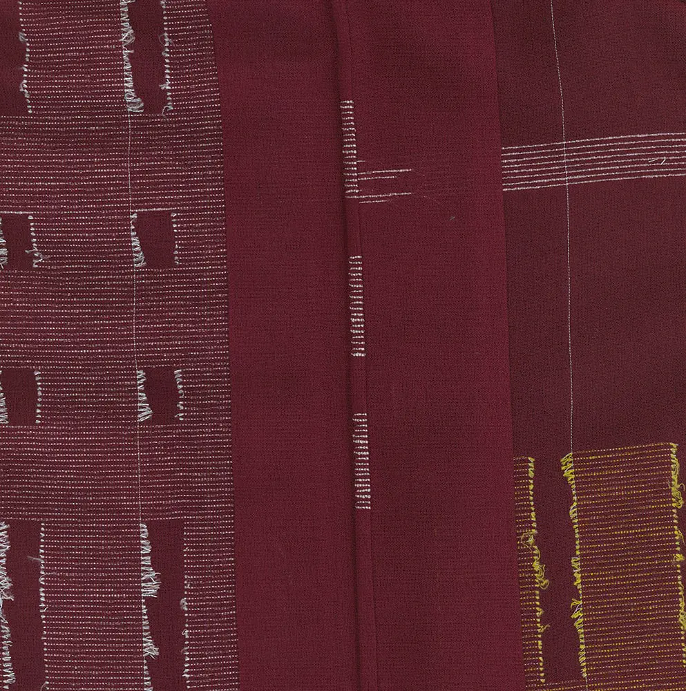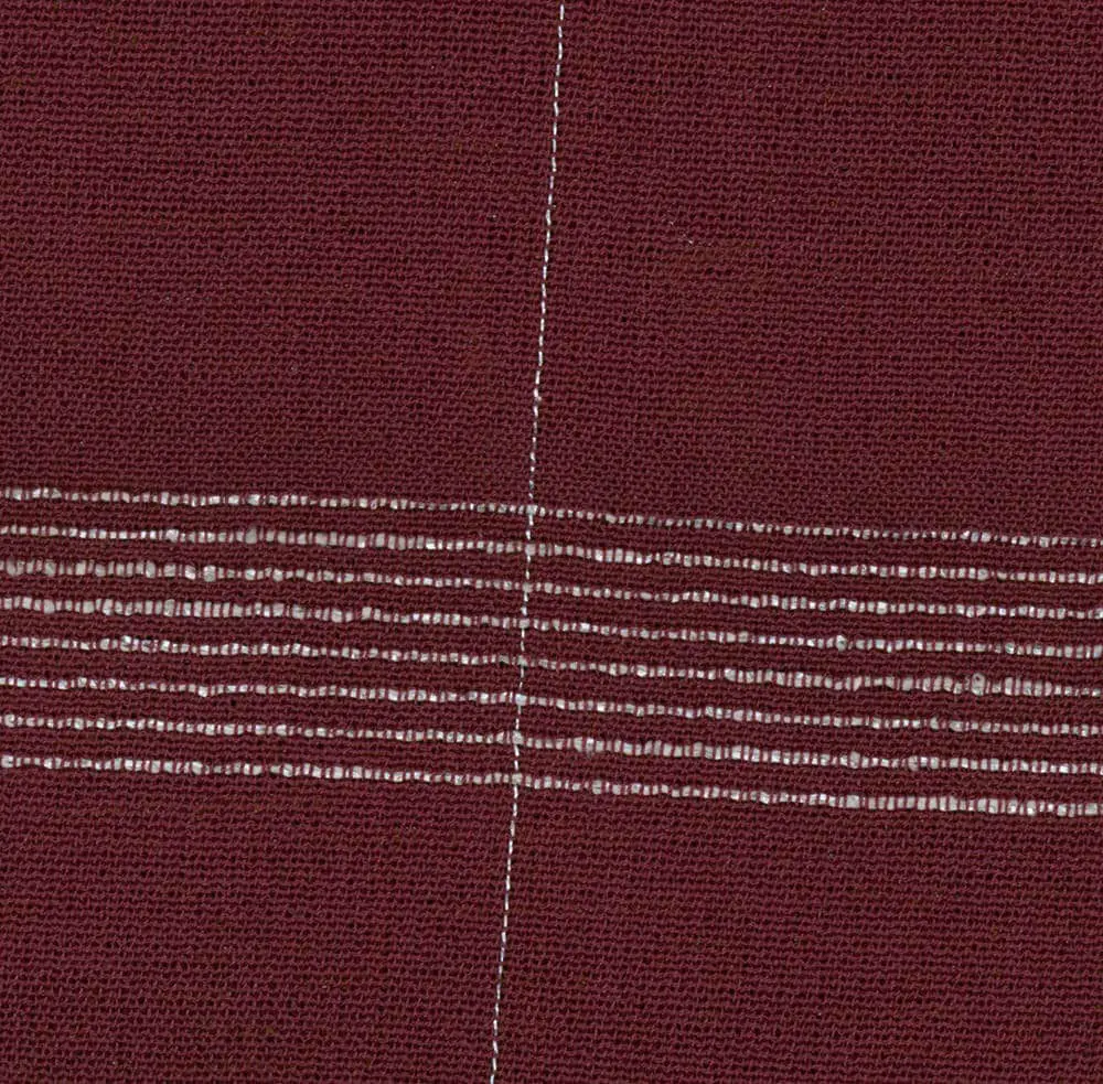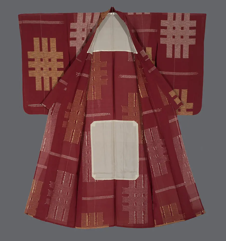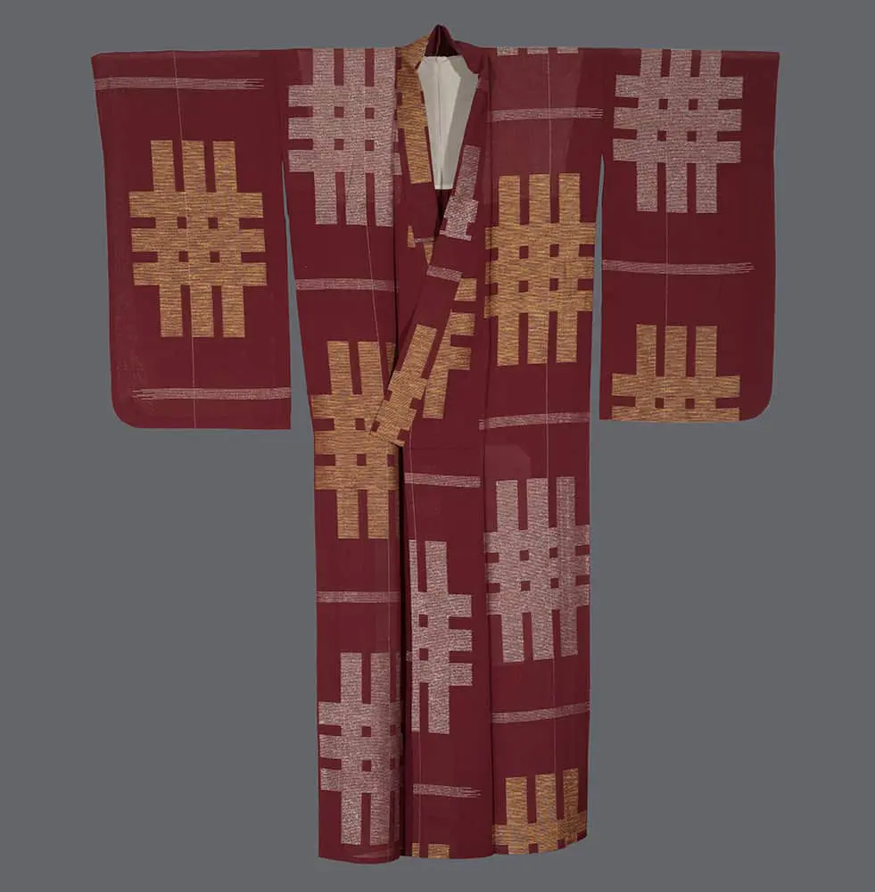 This striking hitoe kimono exemplifies the intersection of traditional Japanese textile arts with modernist design sensibilities that emerged during the interwar period. The textile features bold geometric motifs that appear as stylized cross or plus-sign formations, arranged in a grid-like pattern across the deep burgundy silk ground. These motifs are rendered in contrasting colors - golden yellow and pale pink or silver - using supplementary silk and metallic threads that create textural depth and visual interest.
