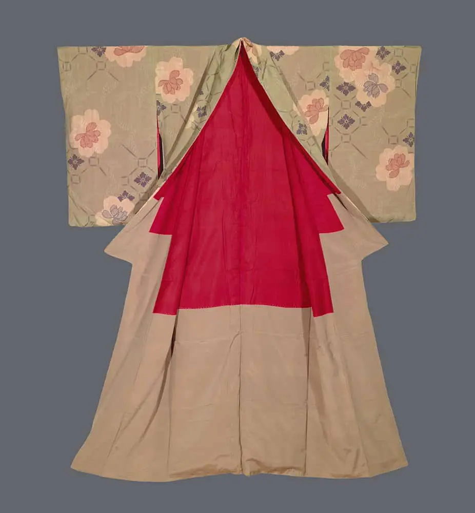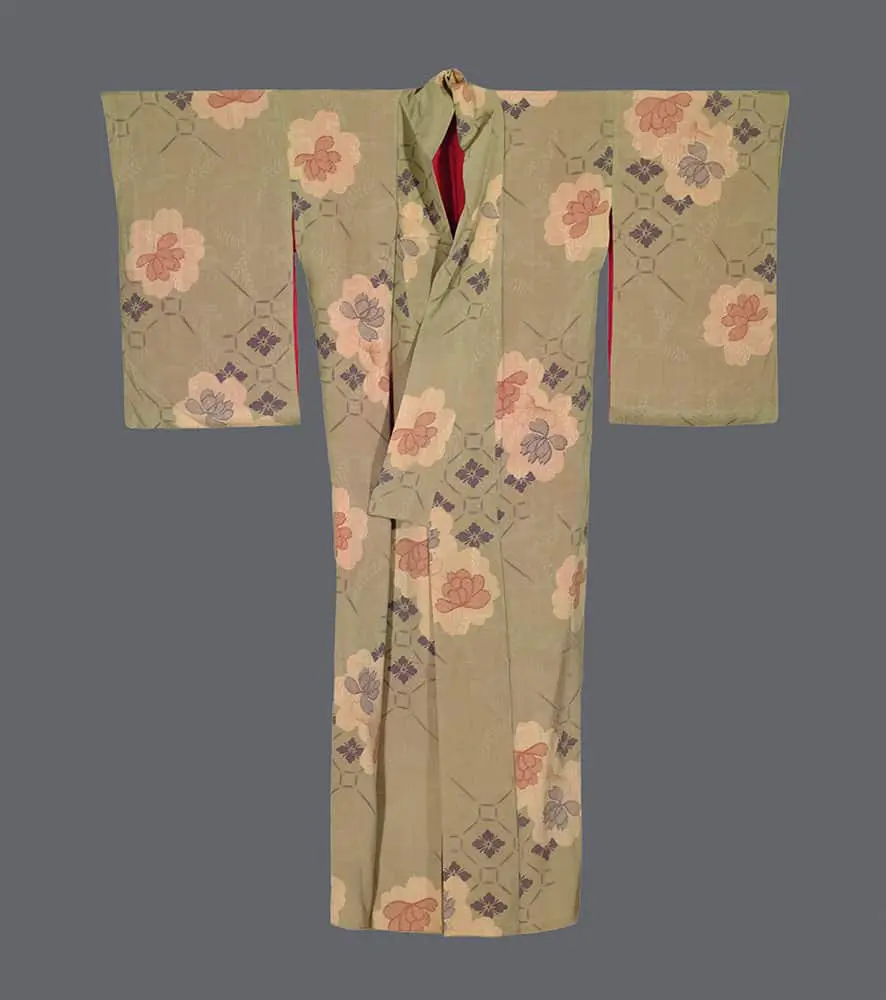This soft silk kimono adorned with blossom patterns is in excellent condition. It measures 48 inches (122 cm) from sleeve-end to sleeve-end and stands at 60 inches (152 cm) in height.
