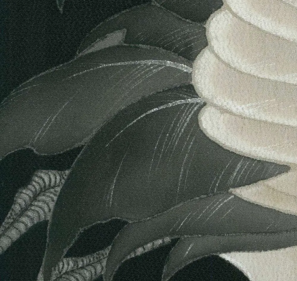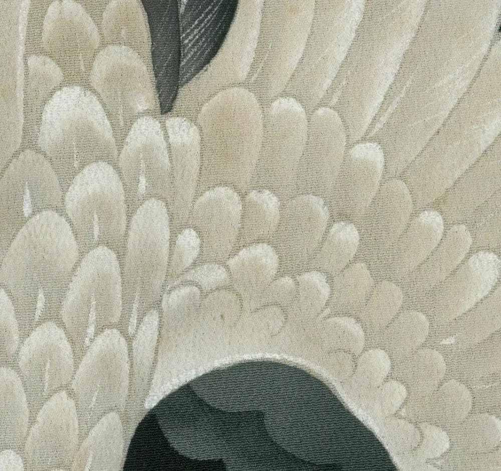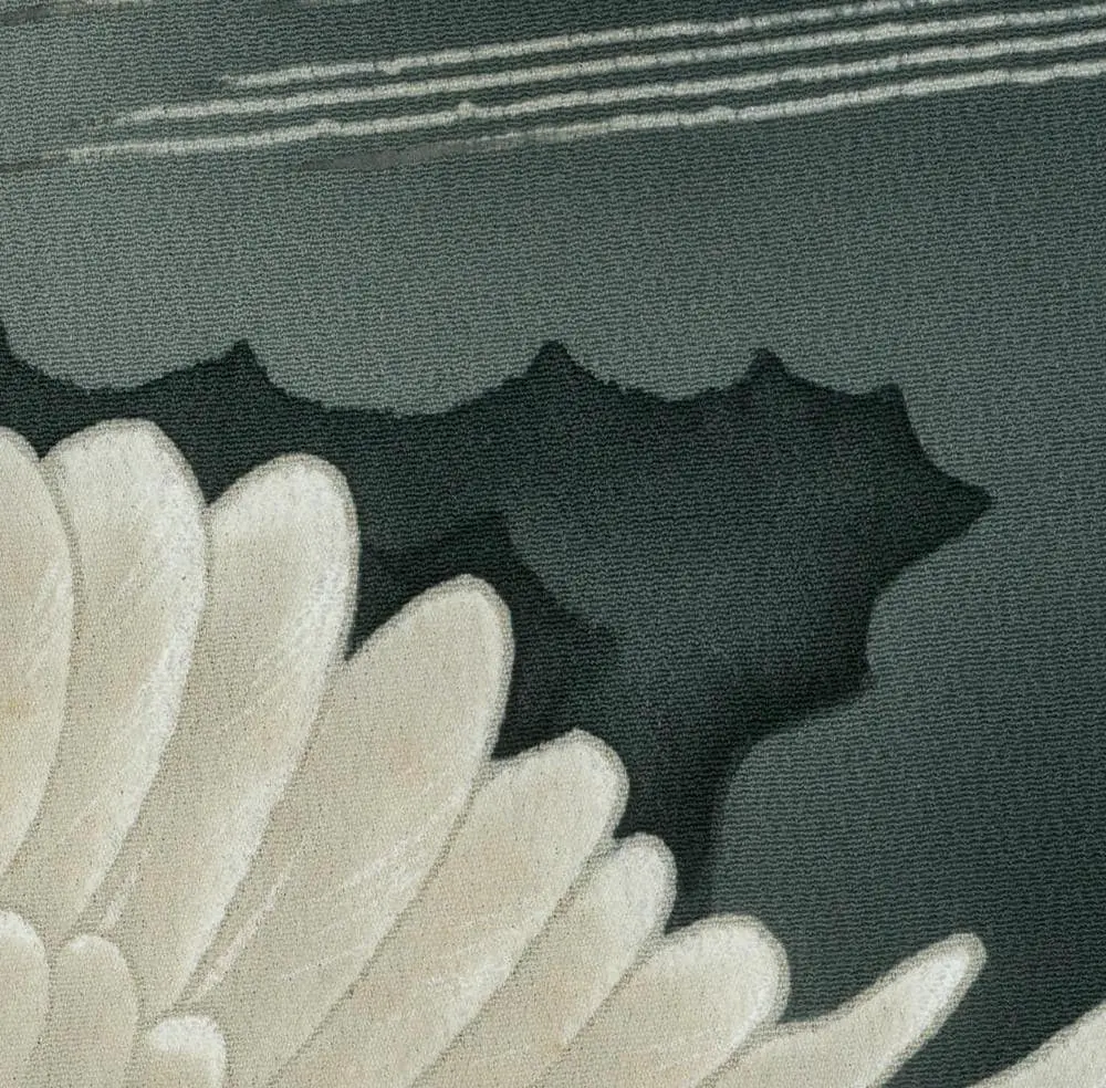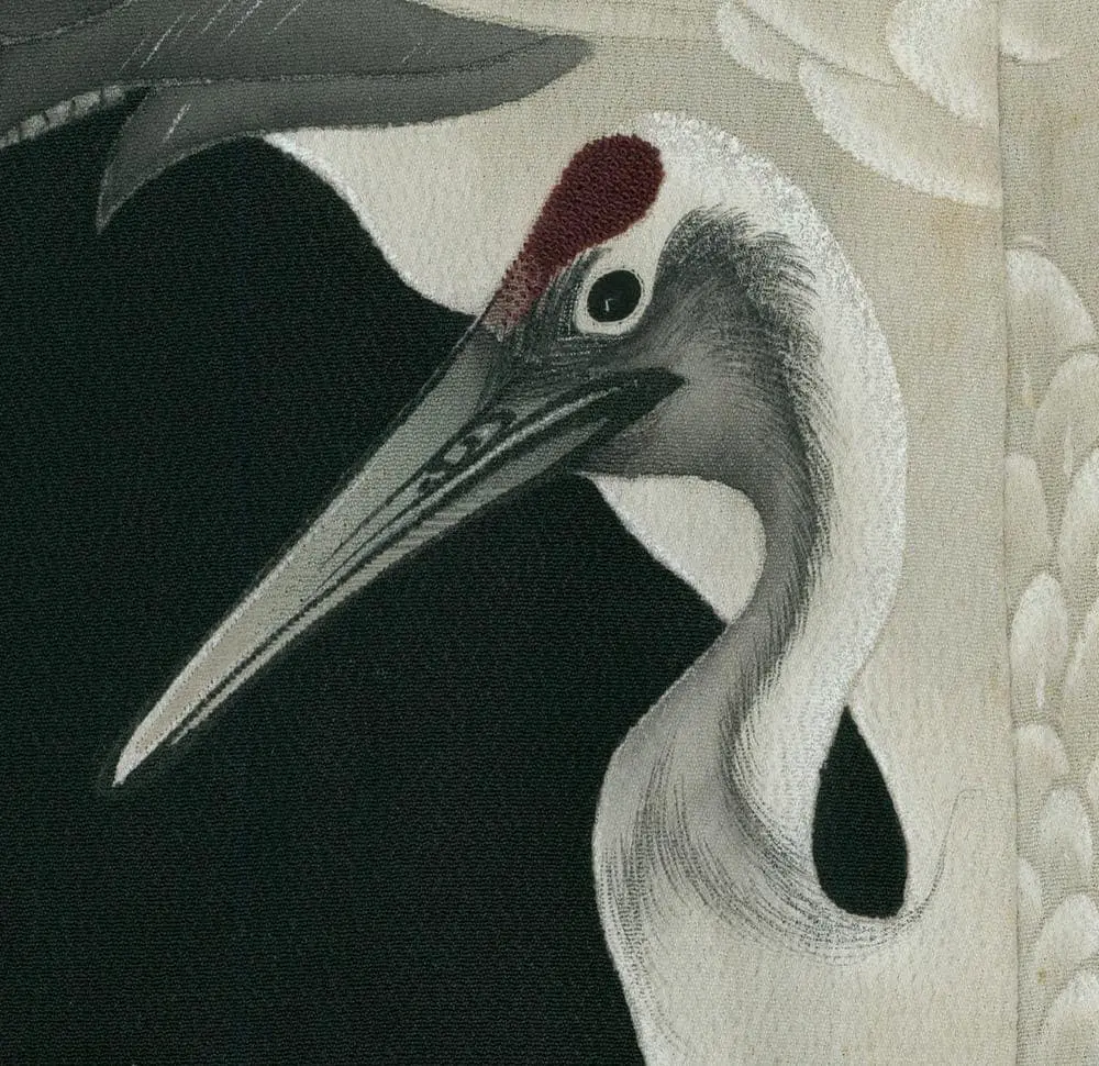 This silk kimono panel showcases a crane in flight, part of the same kimono as item 3155. It boasts yuzen-dyeing, sagara embroidery, and painted highlights, all in very good condition. The panel measures 15 inches (38 cm) in width and 42 inches (107 cm) in height.
