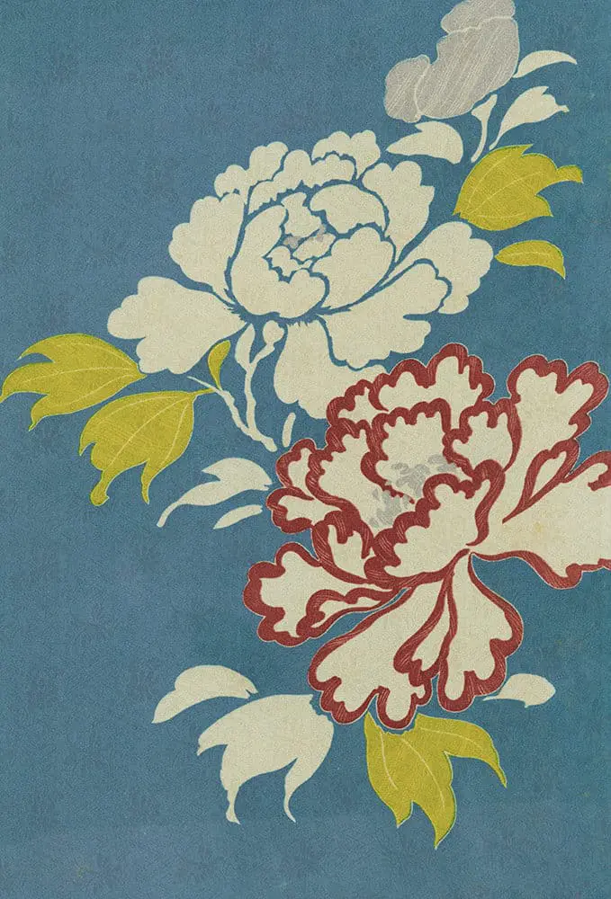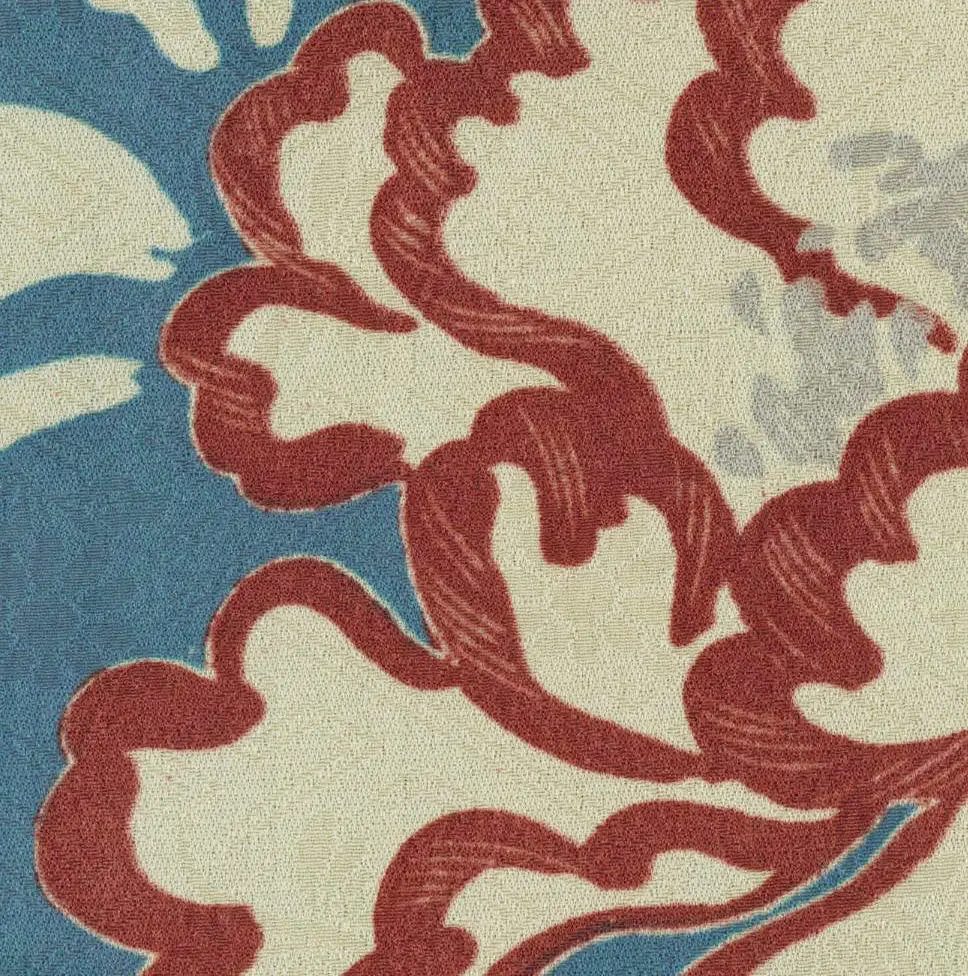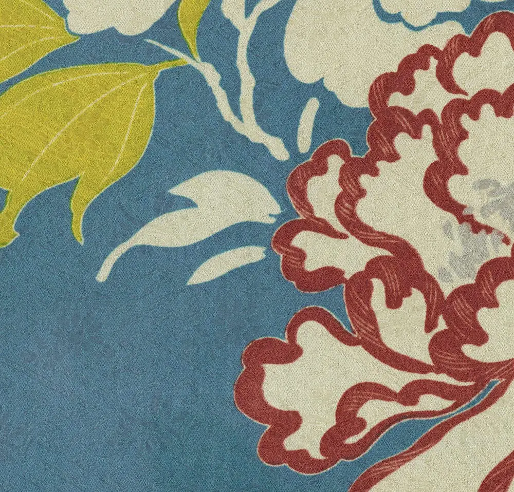 This kimono panel showcases a stunning turquoise rinzu silk adorned with intricate peony and camellia flowers. The white peonies have red variegated outlines, complemented by red and white camellias and sunny yellow leaves. This panel, measuring 13.5 inches (34 cm) in width and 61 inches (155 cm) in length, features a soft silk texture with an exceptional drape.