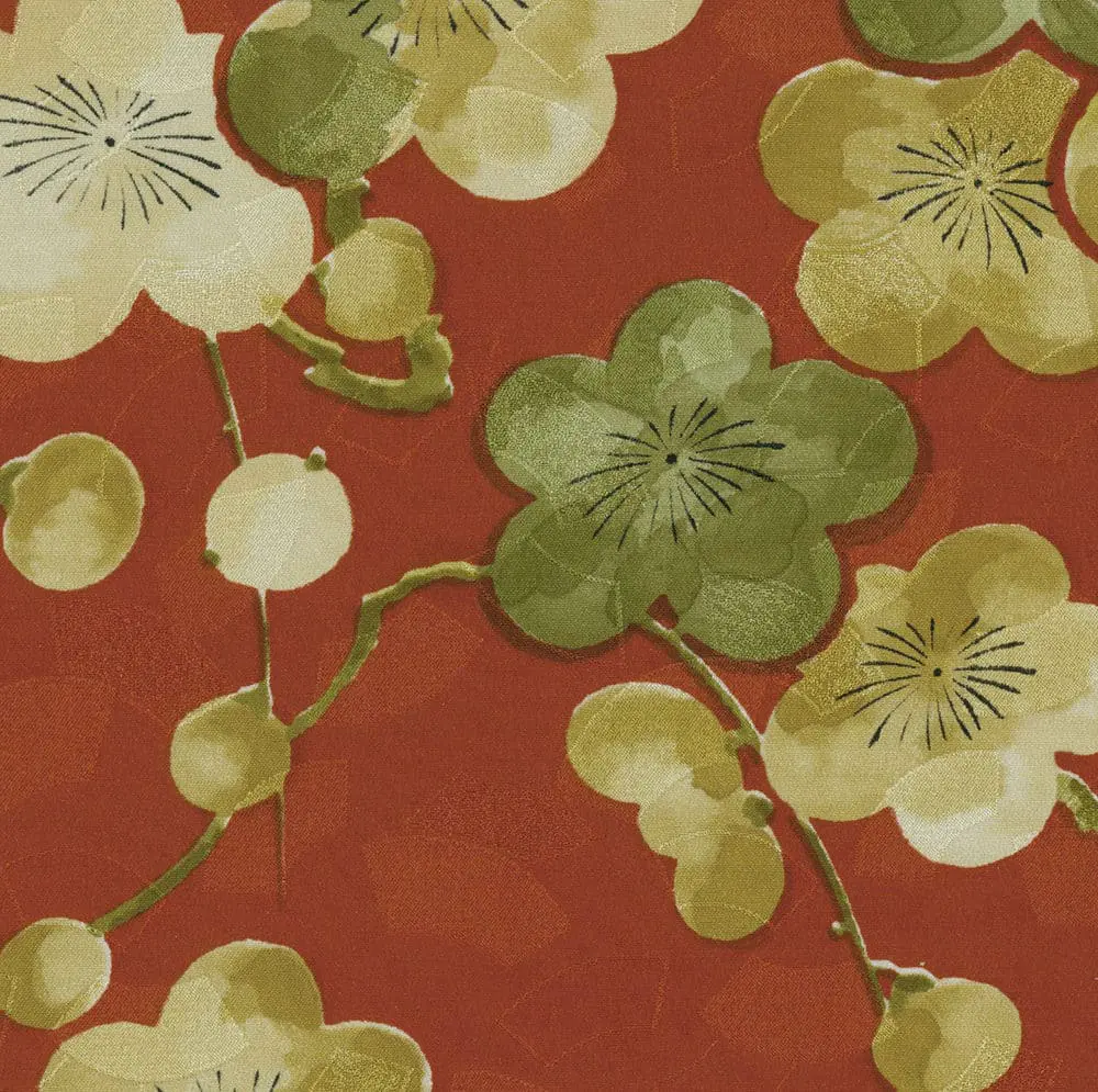 This is a kimono panel featuring bold hand-painted ume (plum blossoms) in shades of golden yellow and medium forest/sage green on a vintage rinzu silk background in a bright shade of red-orange. The rinzu fabric has a woven fan pattern, offering a soft, shimmery texture and excellent drape. It measures 13 inches (33 cm) by 45 inches (114.3 cm).