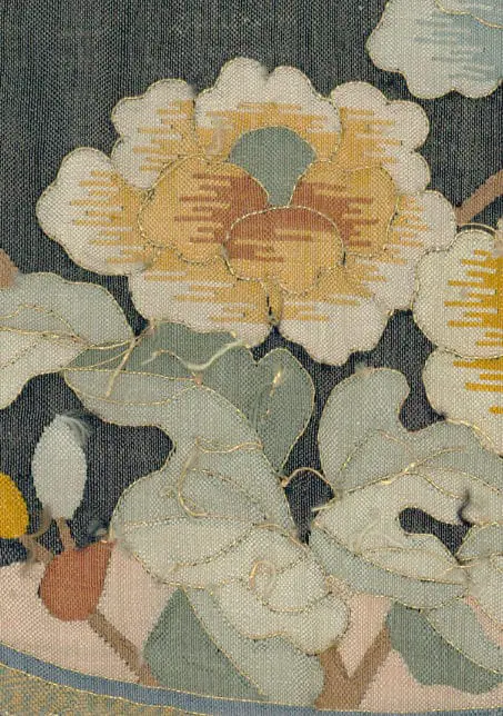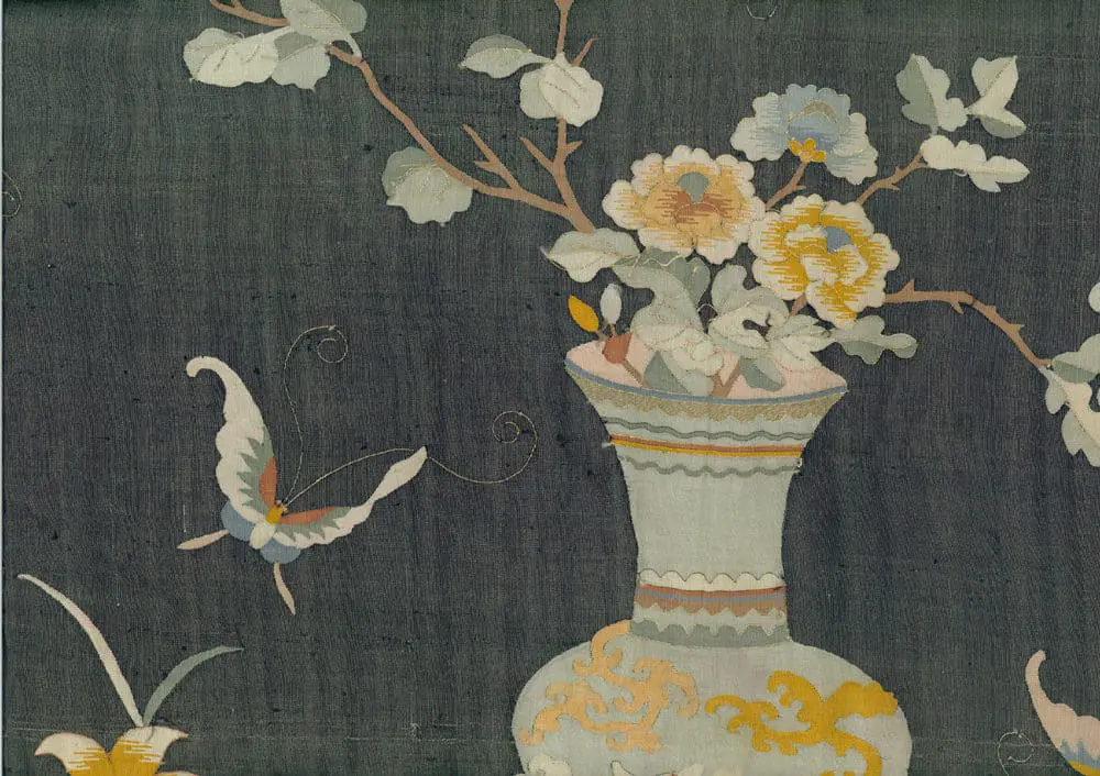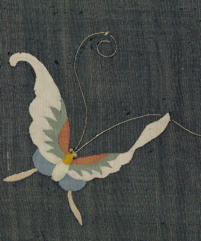 This paper-thin silk slit tapestry panel exhibits a vase, flowers, and butterflies intricately worked with silk and metallic threads against a dark, hand-woven background. Remarkably lightweight, estimated to weigh between 4-6 ounces, it features a dry, crisp surface texture. Overall, the condition is very good, although there are a few small tears at the extreme upper left edge and some loose threads, along with several picked threads. Measuring 69 inches by 32 inches (175 cm x 81 cm), this panel represents a delicate yet artful display of silk craftsmanship.