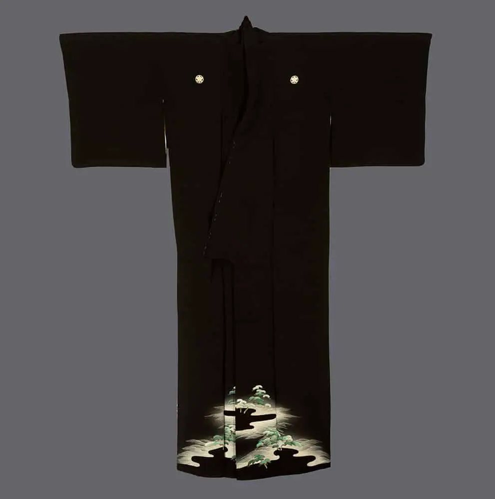 This chirimen silk kurotomesode displays yuzen-dyed pine tree motifs. Measuring 49 inches (124 cm) from sleeve-end to sleeve-end, it stands 60 inches (152 cm) tall. The inner white lining is crafted from handspun silk. It's noted to be in very good condition, with only minor imperfections.