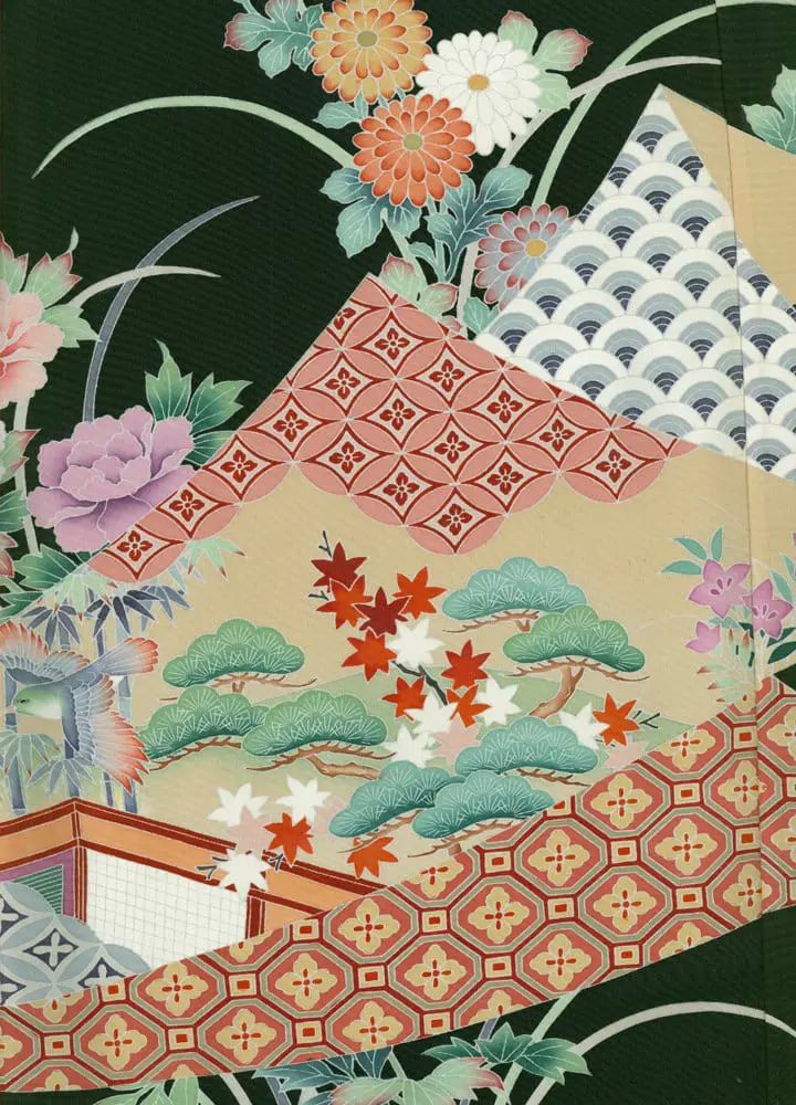 This kurotomesode showcases exquisite yuzen-dyeing techniques that transform the lower portion of the black silk into a spectacular garden tableau while maintaining the sophisticated restraint essential to this most formal category of kimono. The garment's design follows the classical kurotomesode format, with its dramatic black upper field punctuated by five mon (family crests) and an elaborate decorative scheme concentrated along the hem, creating a striking visual hierarchy that draws the eye downward to the intricate floral arrangements. The yuzen technique, perfected during the Edo period, allows for painterly effects that blur the line between textile art and fine painting, evident in the naturalistic rendering of chrysanthemums, cherry blossoms, and seasonal foliage that cascade across geometric patterns and decorative objects suggesting precious lacquerware or ceramic vessels.