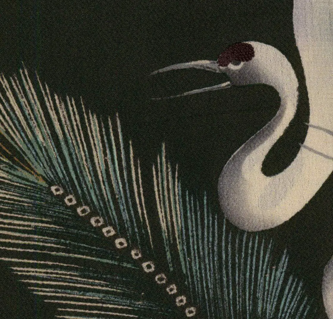 A silk kurotomesode formal kimono featuring classic auspicious crane and pine motifs accomplished with yuzen-dyeing with embroidery and sagara highlights. Very good condition, with minor imperfections. 50" from sleeve-end to sleeve-end x 61" height.