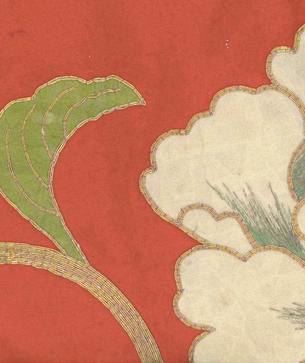 This pair complements item 2300, likely dedicated in the same year, 1878. It features embroidered applique peonies on a red bast-fiber background. Measuring 80 inches by 49 inches (203 cm x 124 cm), it's in good condition, showing some tiny holes in the lower red background. Peonies hold significance in Japan as a symbol of nobility. Interestingly, Buddhist monk Kong Hai introduced tree peonies to Japan in the 8th century for medicinal purposes.