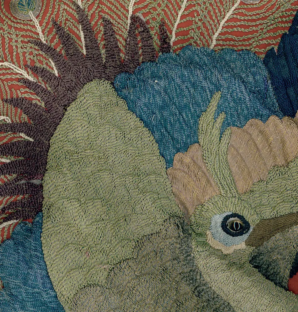 This large uchishiki showcases a phoenix embroidered using metallic and silk threads on a red bast fiber background. Handwriting on the back cotton lining dates the dedication of this cloth to the year 1875, with a repair noted in 1973. In good condition, it does exhibit some minor holes, stains, and small areas of loose embroidery, mainly within the bird's legs as seen in the images provided. Measuring 84 inches by 51 inches (213 cm x 130 cm), this piece carries historical significance and craftsmanship worth noting.