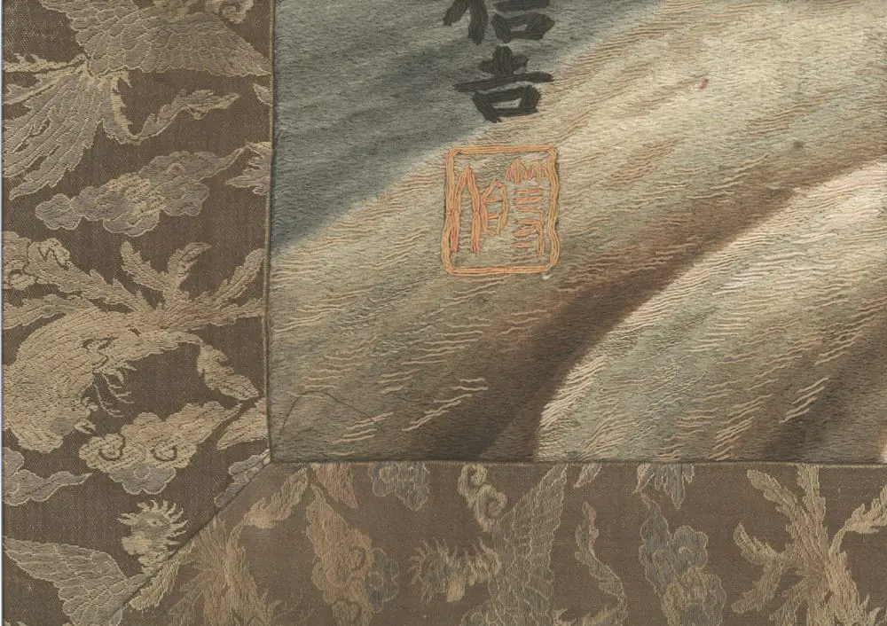 This fully-embroidered silk panel likely originated in a prestigious Japanese specialty workshop, possibly indicated by the embroidered "signature" denoting the workshop's name (refer to detailed images). Bordered by a woven border and backed with a sturdy woven dark green lining, it's in excellent condition, measuring 84 inches by 60 inches (213 cm by 152 cm).