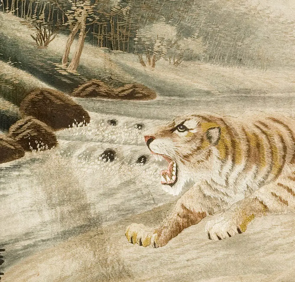 The symbology embedded within this panel intertwines Buddhism and traditional Japanese philosophies. Tigers and bamboo have deep roots in Buddhist teachings, symbolizing the spiritual force needed to confront life's adversities. The tiger embodies bravery and determination, while the bamboo represents humility, flexibility, and longevity—a dichotomy reflecting the perpetual movement of the world, central to Japanese Zen philosophy.