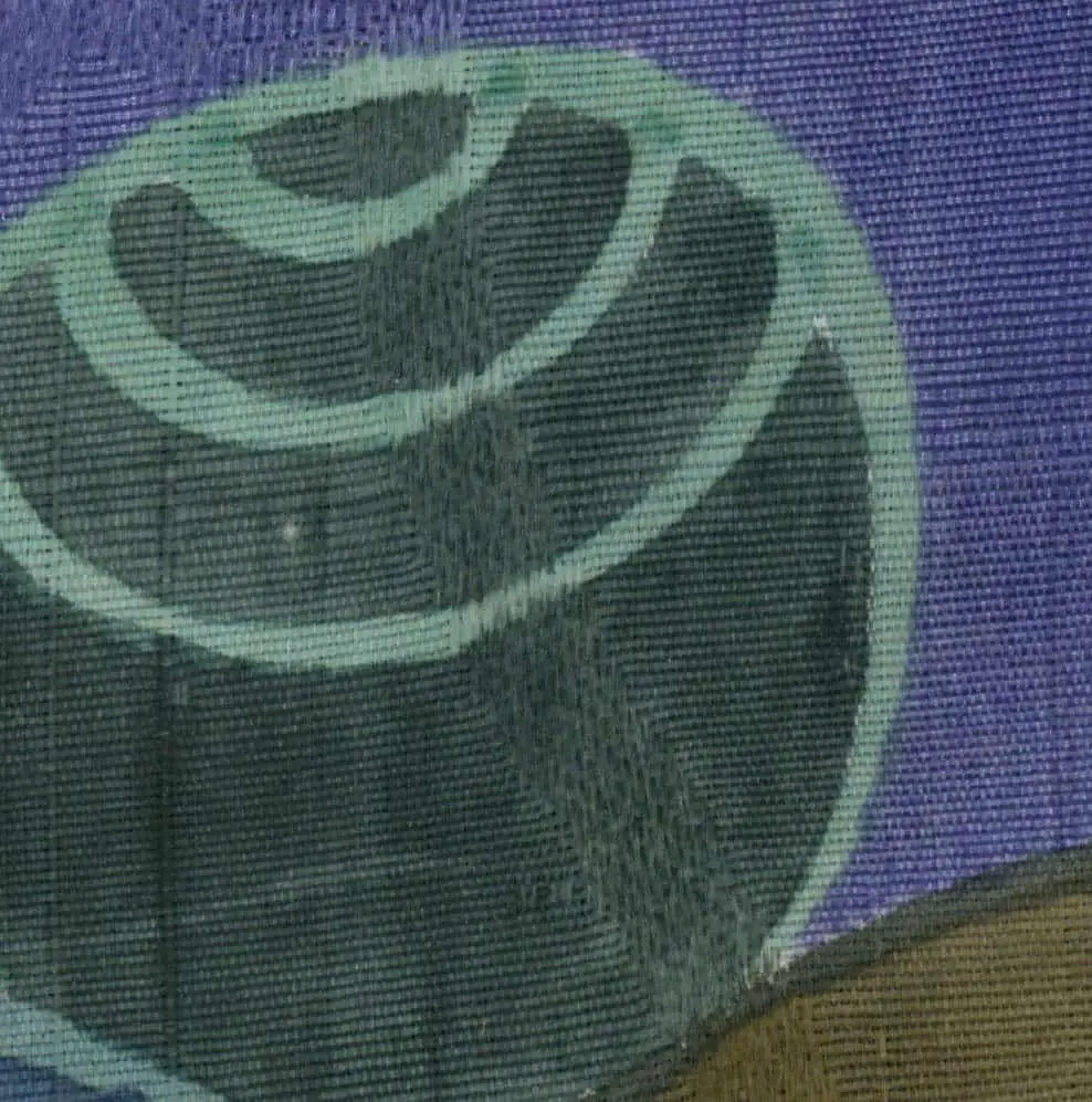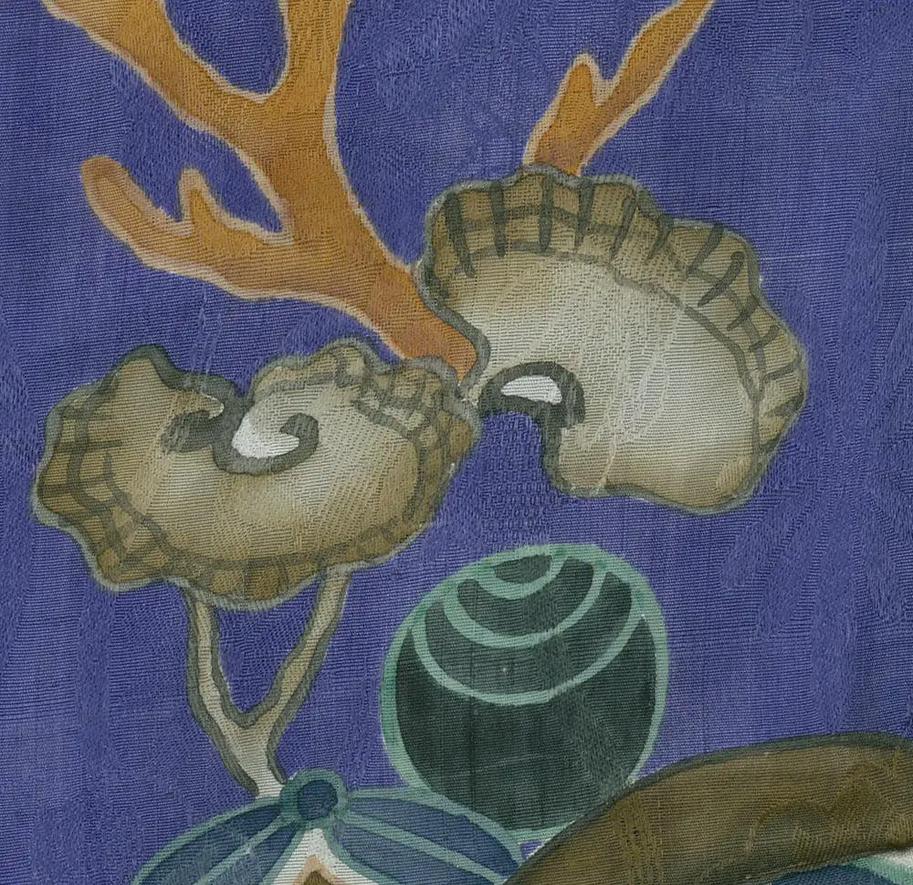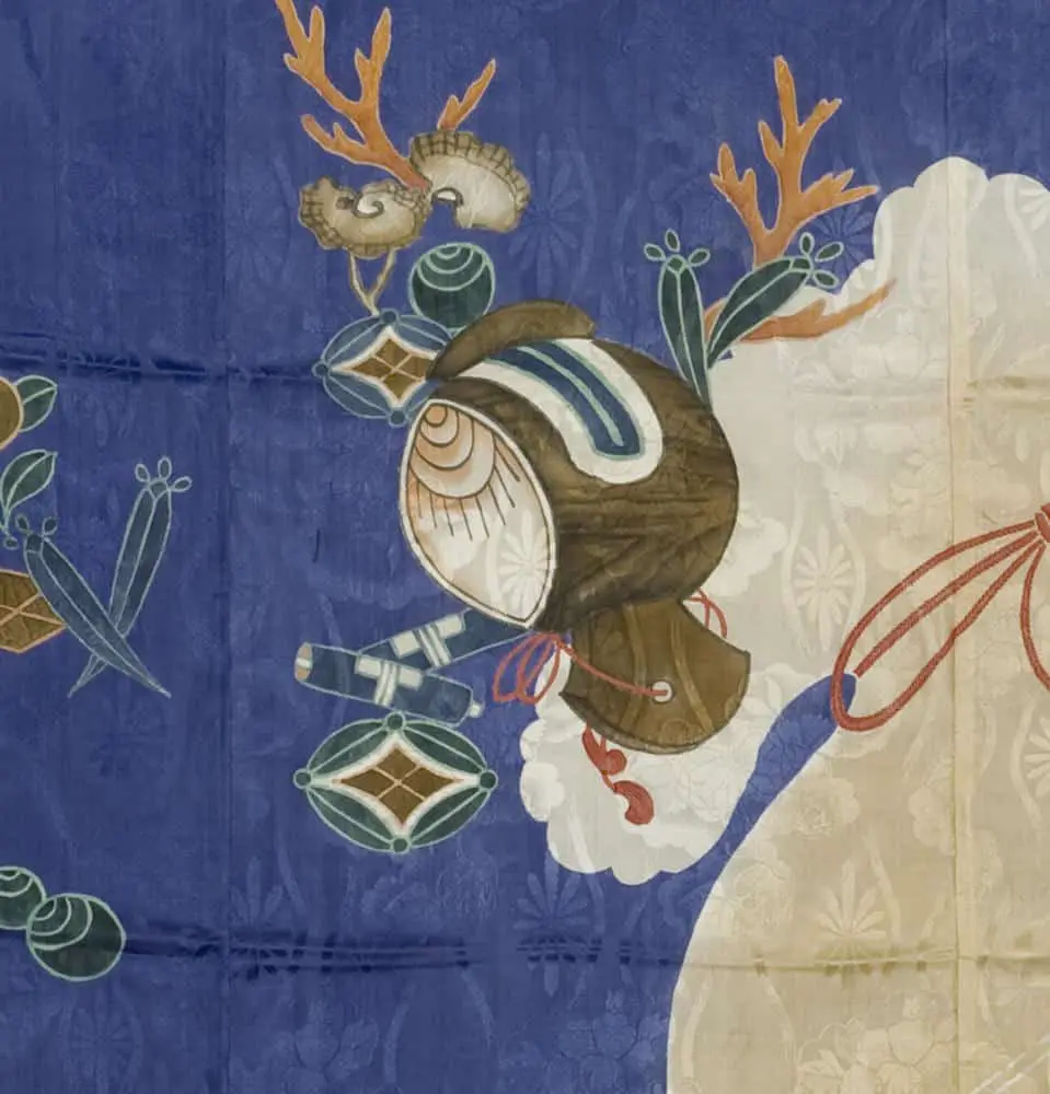 This unique large rinzu silk fukusa displays a yuzen-dyed takara bag overflowing with treasures. It's in very good condition and measures 41 inches by 44 inches (104 cm x 112 cm).