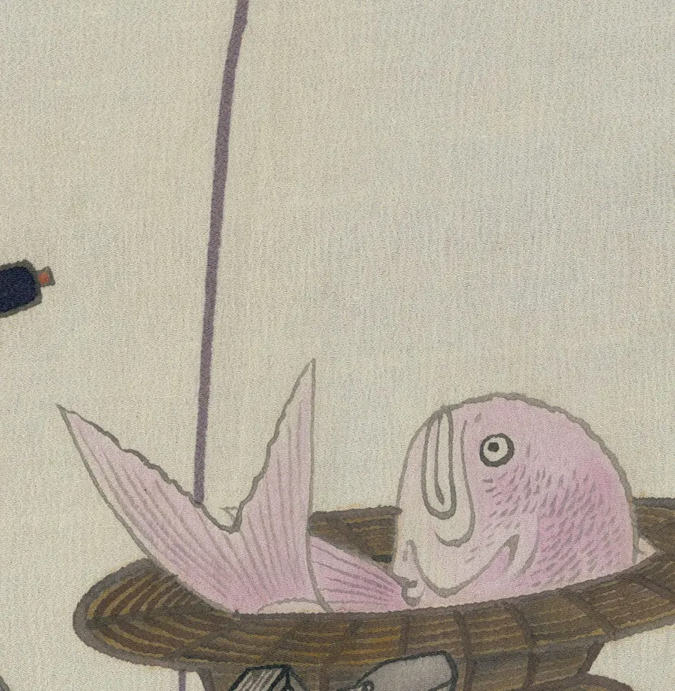 This rare and sizable fukusa from the Kaga district of Japan is crafted from chirimen silk, showcasing a takara ship motif created using the yuzen technique. It remains in very good condition and measures 34 inches by 39 inches (86 cm x 99 cm).