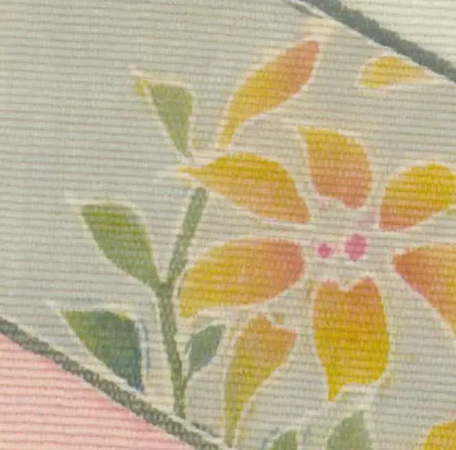 This substantial fukusa presents refined yuzen-dyeing and intricate embroidery details. Overall in very good condition, it has one missing tassel, some faint smudges, and a small dark stain visible in the lower left area of the gallery image. It measures 26 inches (66 cm) by 32 inches (81 cm), embodying the fan motif, a common artistic expression in Japan practiced by esteemed artists and enthusiasts alike. While some fan motifs curve upwards, this fukusa demonstrates the same shape curving downwards, offering a unique perspective into daily life, as a Japanese proverb suggests.