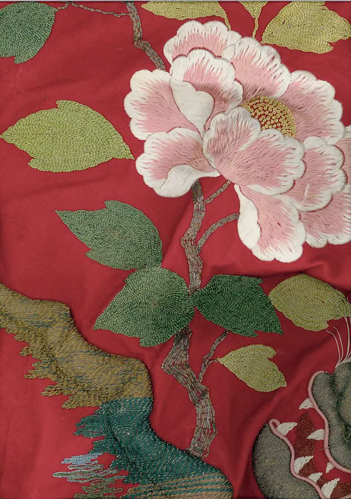 This large Buddhist temple uchishiki showcases metallic three-dimensional embroidery on a red felt background. In Japanese tradition, lions and peonies hold significant associations with Buddhism. The lion, dancing energetically among peonies, symbolizes the celebration of longevity and a joyful life.