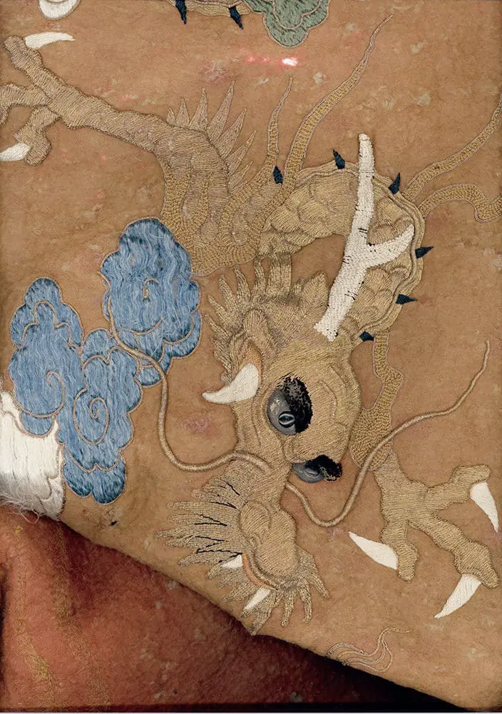 This vast Buddhist altar cloth, comprised of a felted wool backing intricately embroidered with couched and embroidered dragons and clouds, spans 74 inches by 45 inches (188 cm x 114 cm). However, it's in fair condition, displaying various holes and missing threads, which affect its overall appearance and structure.