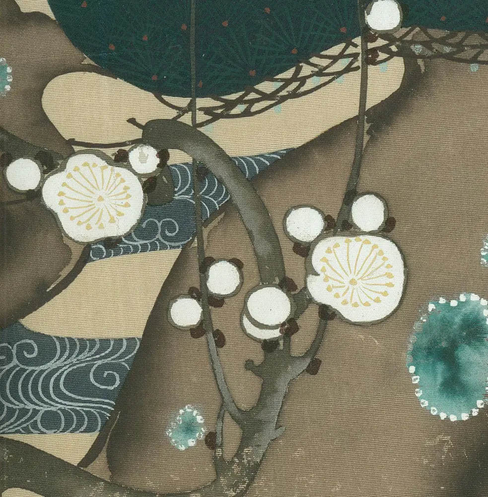 This silk gift cover, measuring 25 inches by 30 inches (64 cm x 76 cm), presents a pine motif crafted using the yuzen-dye technique, complemented by fully-embroidered cranes and a metallic-thread-highlighted tortoise. Despite being in good condition, there's noticeable overall light chipping of the yuzen paint, particularly near the fold lines.