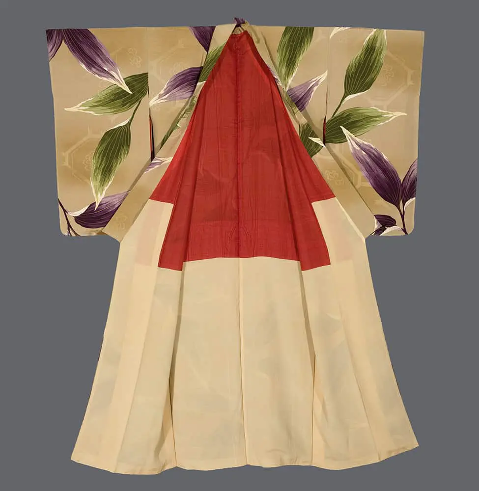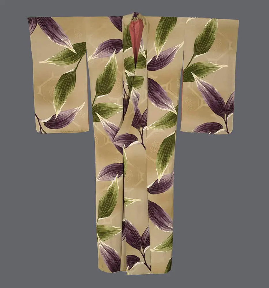 This rinzu (damask) chirimen (crepe) silk kimono presents a masterful synthesis of traditional Japanese textile techniques with the emerging modernist aesthetic of the early 20th century. The garment features large-scale stenciled leaves in rich purple and vibrant green against a warm golden-beige ground, creating a bold botanical pattern that flows gracefully across the fabric surface.