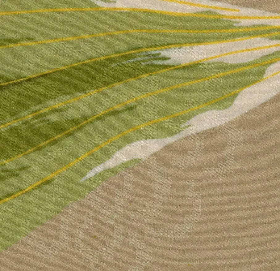 The technical achievement here is remarkable - the combination of rinzu damask weaving with chirimen crepe silk creates a complex textural foundation that adds depth and richness to the stenciled design. The detail images reveal how the damask patterning creates subtle tonal variations within the background, visible as lighter areas that catch and reflect light differently. This creates an almost shimmering effect that makes the golden ground appear to glow beneath the bold leaf motifs.