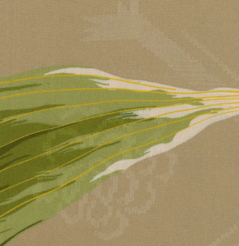 The design demonstrates a sophisticated understanding of scale and movement, with the oversized leaves creating dramatic sweeping gestures that seem to dance across the kimono. This approach to botanical motifs reflects the influence of Art Nouveau's emphasis on natural forms, but rendered with a distinctly Japanese sensibility that emphasizes asymmetrical composition and organic flow. The leaves appear to be depicted in a naturalistic style, with careful attention to their linear structure and subtle gradations of color.